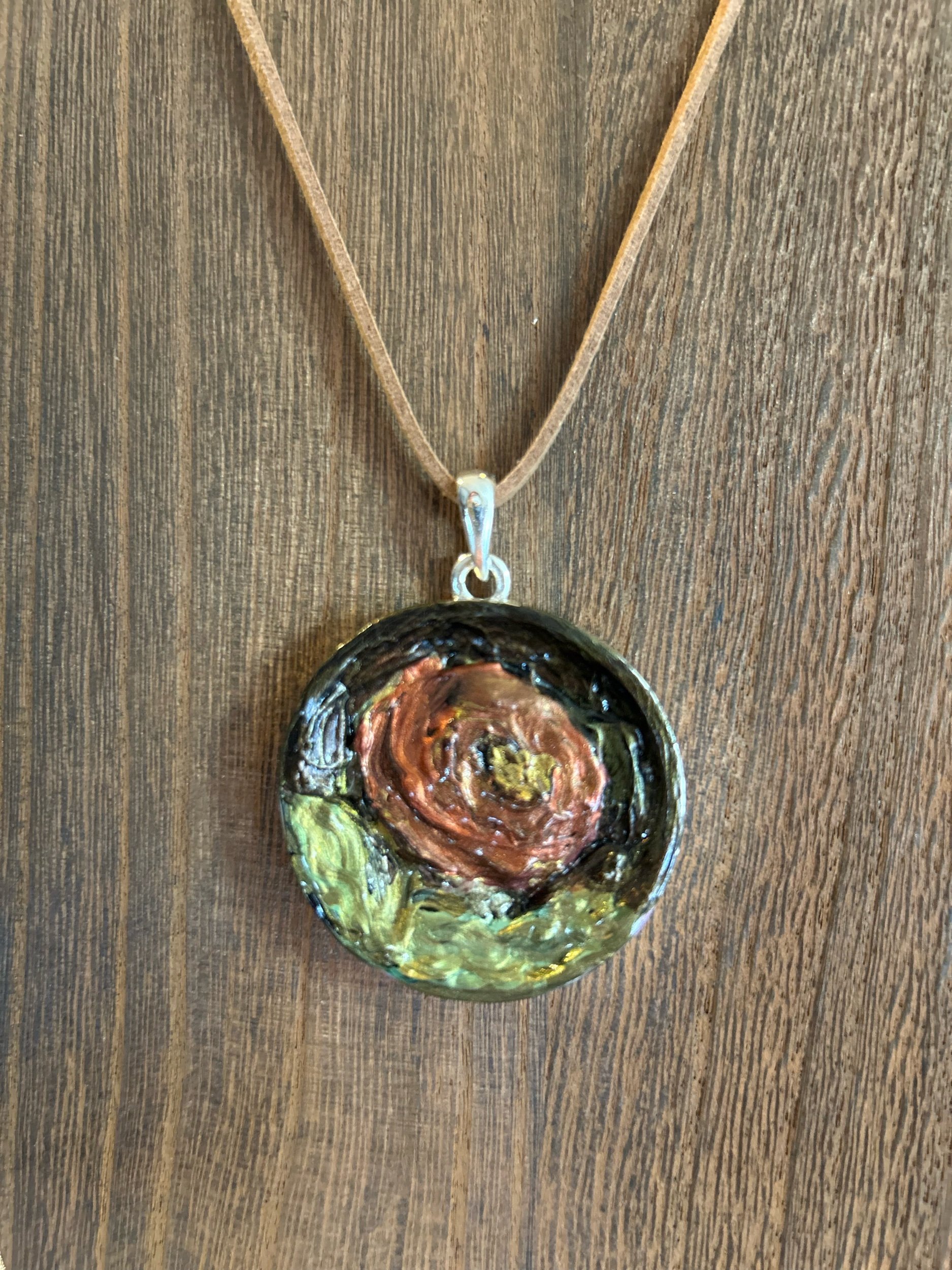 This 23” leather cord necklace comes with a red flower pendant created with modeling paste and acrylic paint and sealed with a glossy medium. Comes with a complimentary hand painted water color card.