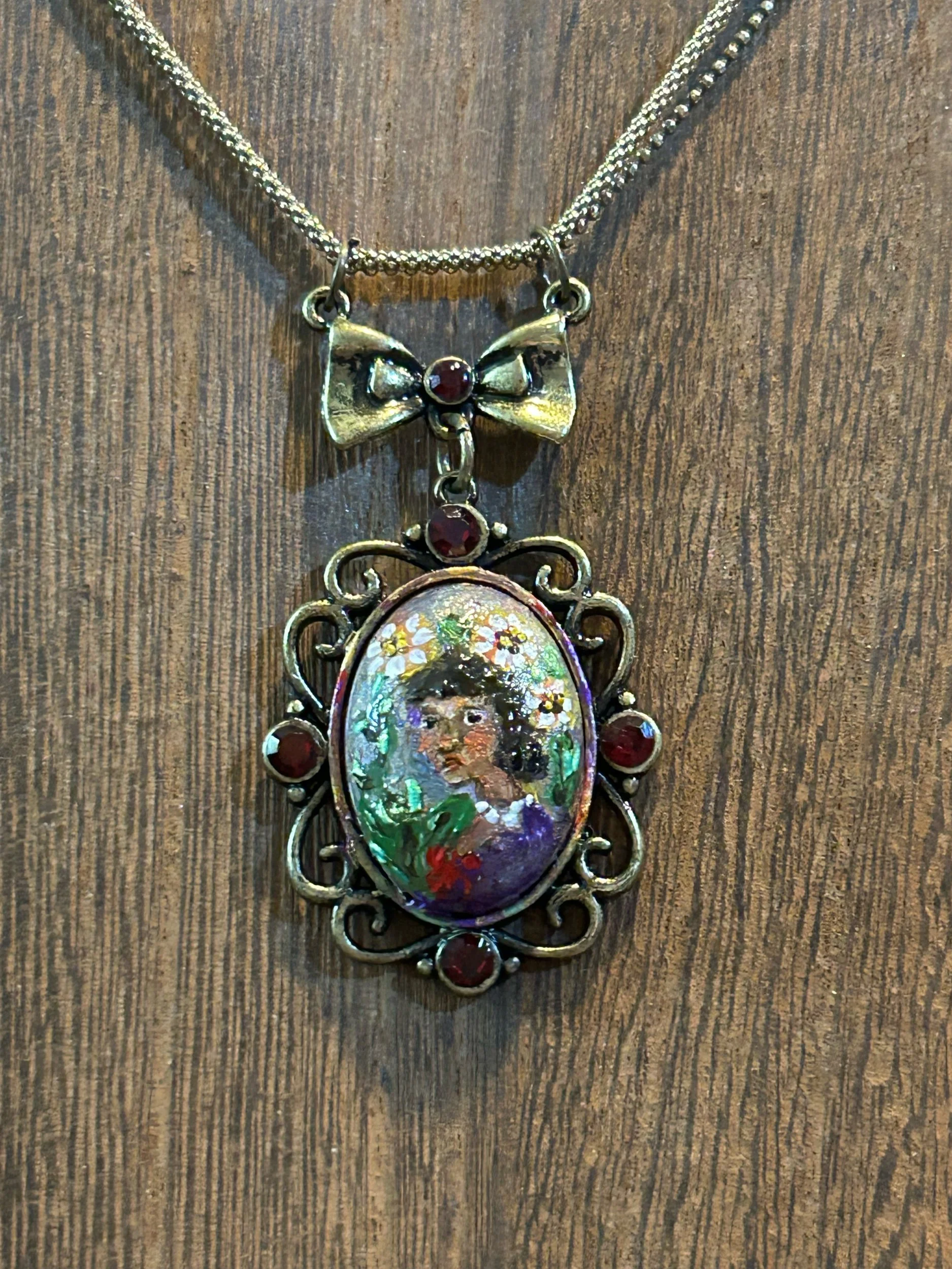 This 14” hand painted portrait pendant is gold plated, nickel free with a vintage antiqued finish. Painted in acrylic and sealed in matte medium, comes with a complimentary hand painted water color card.
