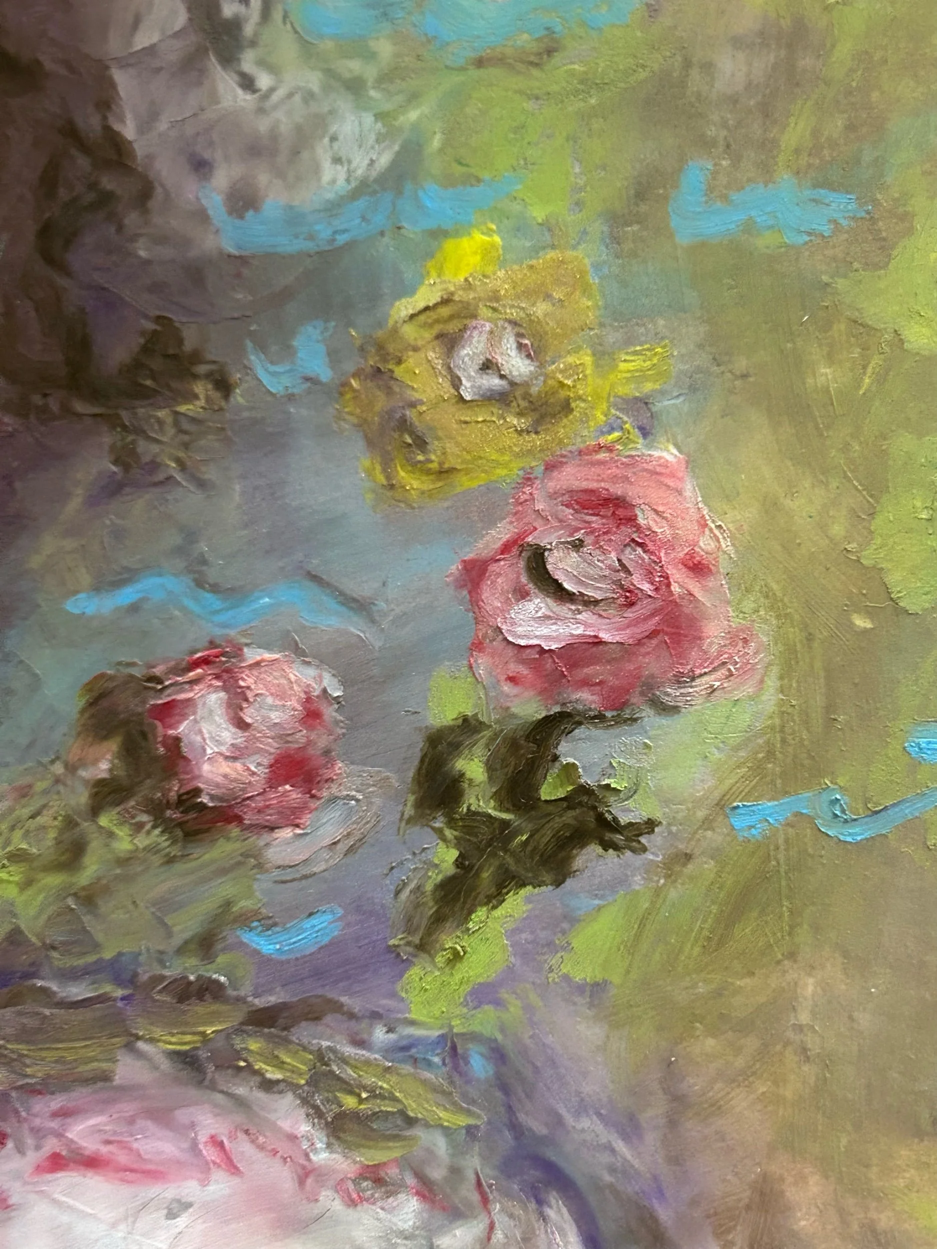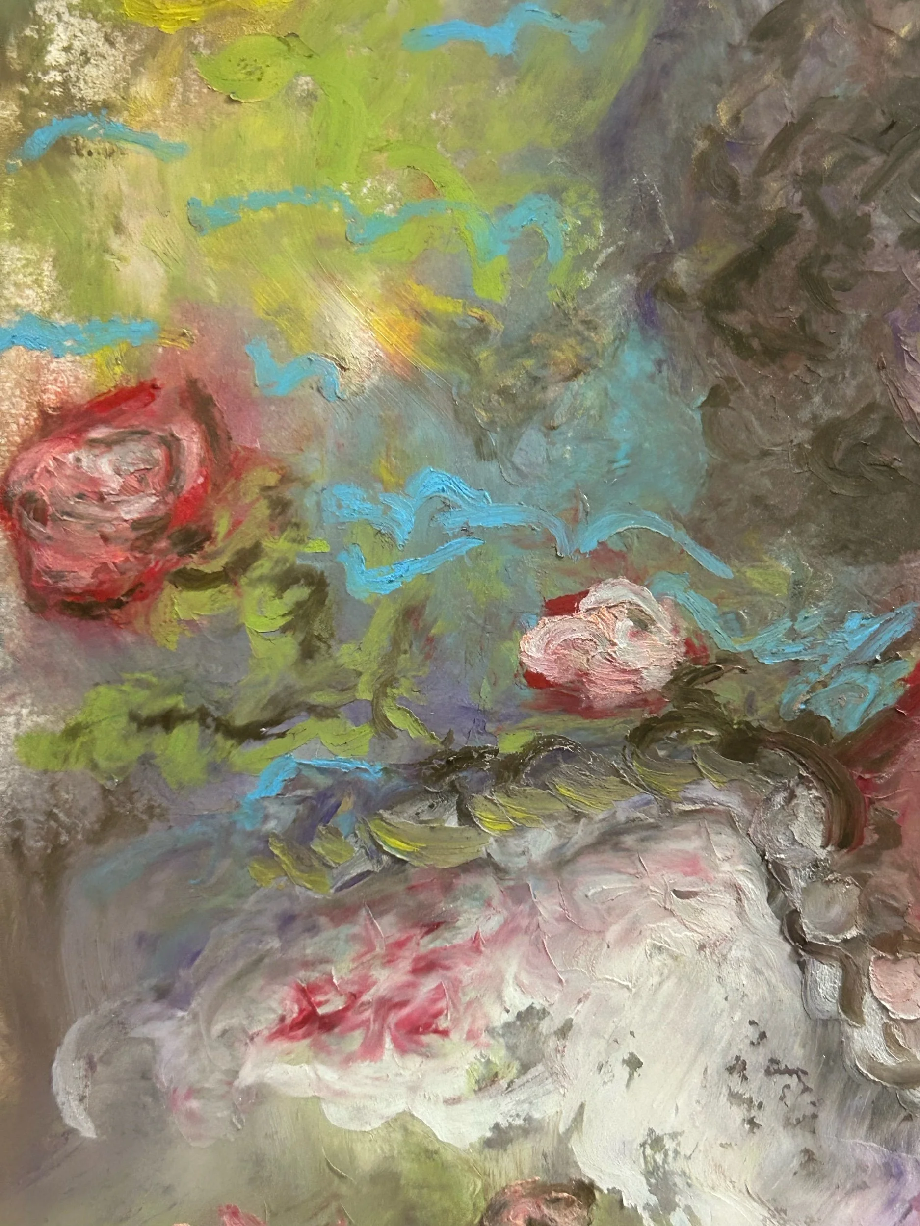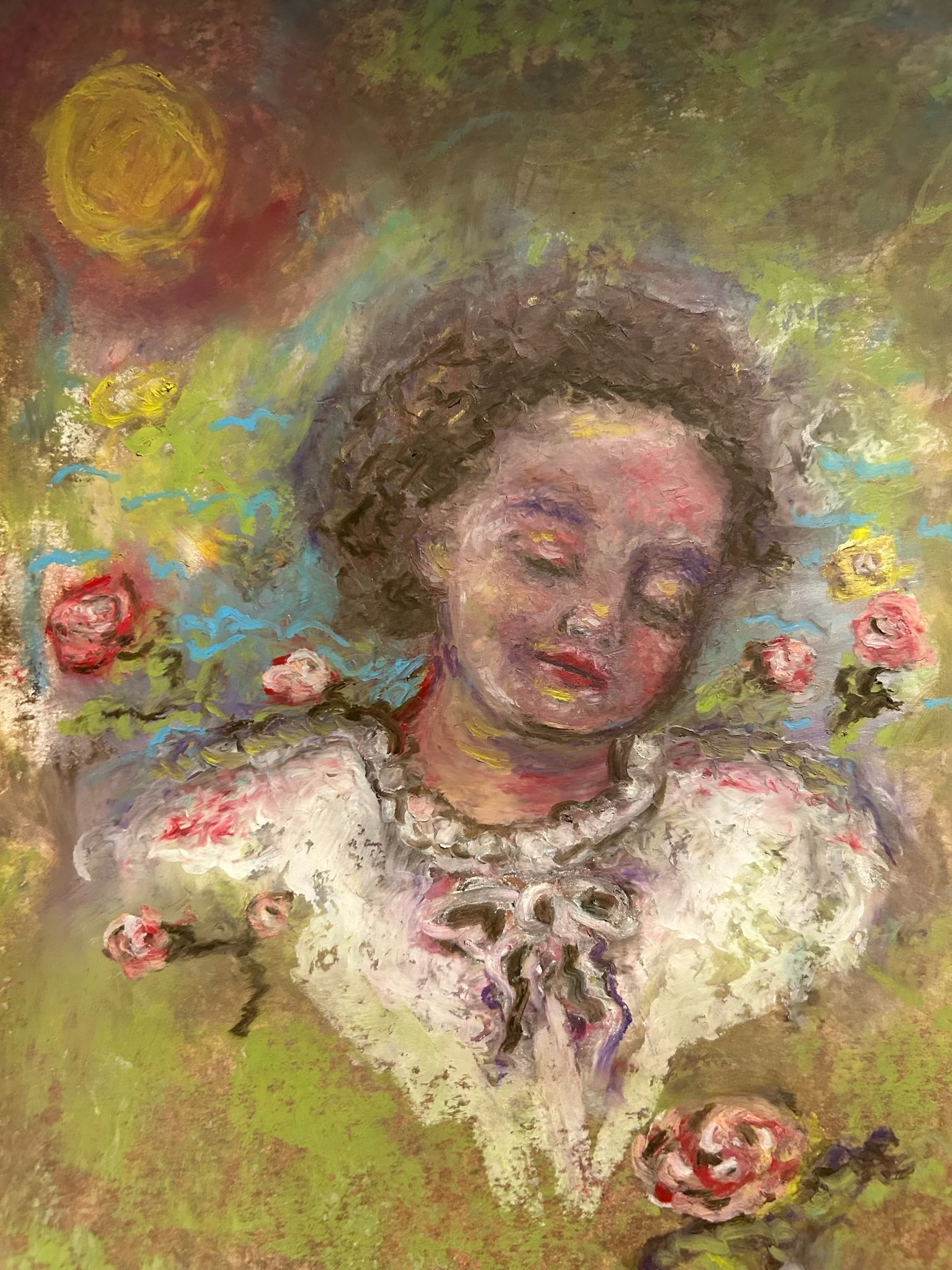 This expressive portrait presents a softly rendered female figure suspended in a dreamlike garden atmosphere. Her eyes are gently closed, suggesting introspection, rest, or an inward listening, while her face is modeled with loose, textured strokes of sennelier oil pastel that blend warm rose, lavender, and muted gold tones. Surrounding her, delicate roses emerge and dissolve into the background, their forms echoing the softness of memory rather than strict realism. The palette is earthy yet luminous—mossy greens, sky blues, and a glowing sun-like orb in the upper corner infuse the scene with warmth and quiet vitality. Her white dress, accented with a ribboned bow at the neckline, is painted thickly, almost sculptural, anchoring the figure amid the fluid, atmospheric surroundings. Overall, the composition feels intimate and contemplative, evoking themes of femininity, vulnerability, and the tender intersection between inner life and the natural world.