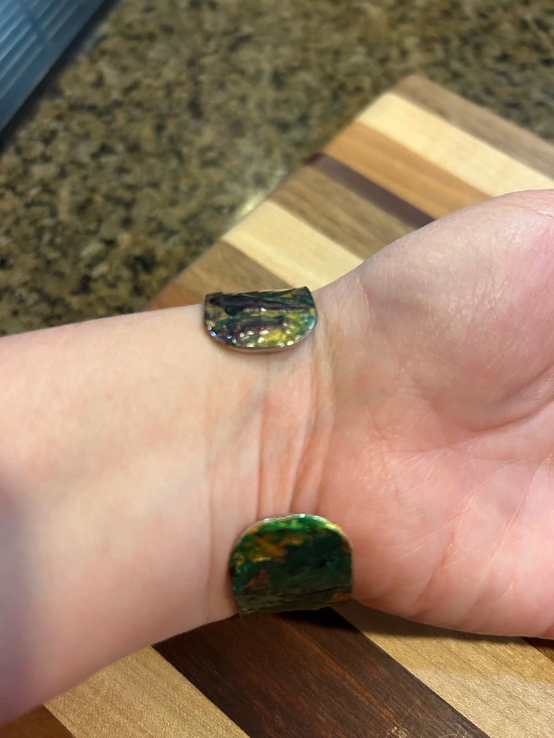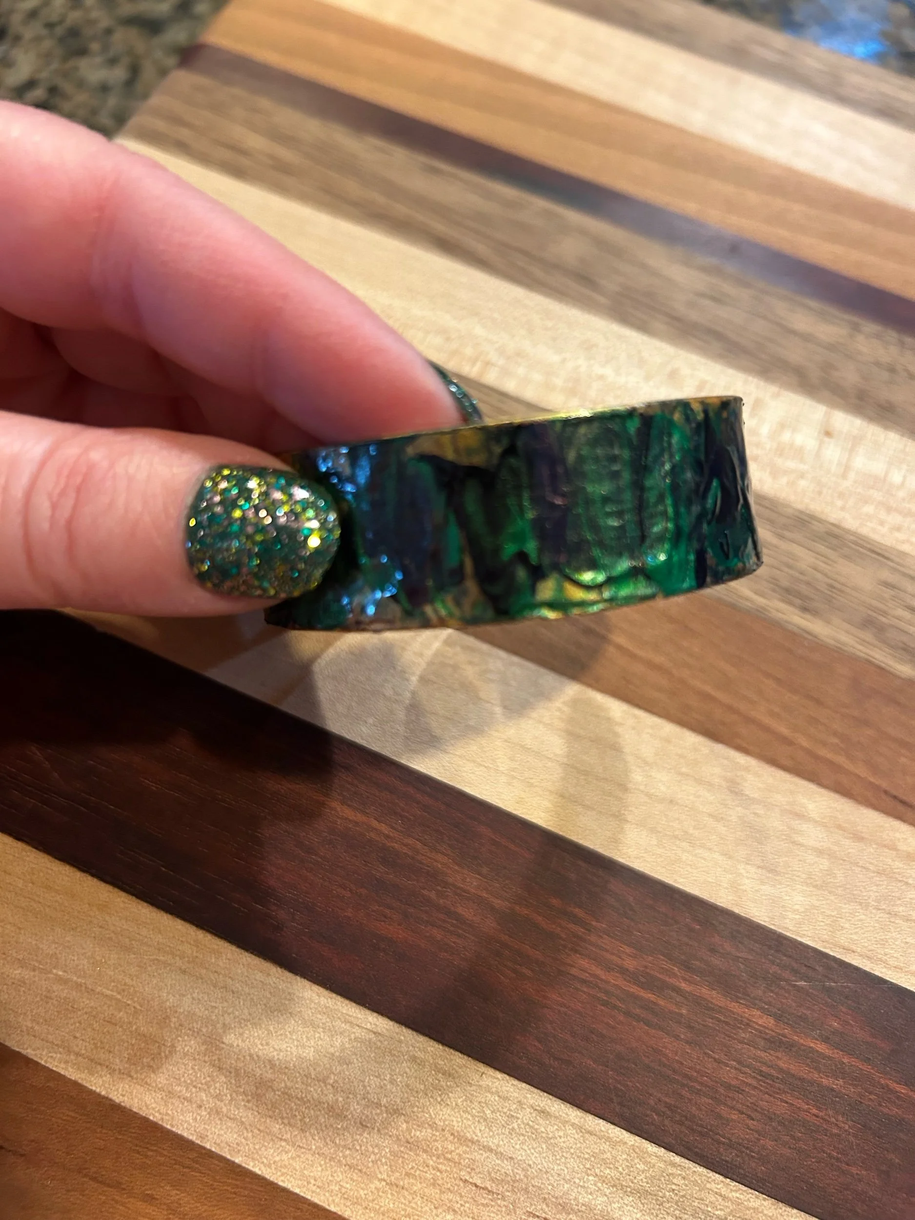 This silver plated nickel free hand painted bracelet is painted in acrylic paint and sealed in high gloss medium. A beautiful piece of wearable abstract art! Easily bends for better fit. Comes with a complimentary hand painted water color card.
