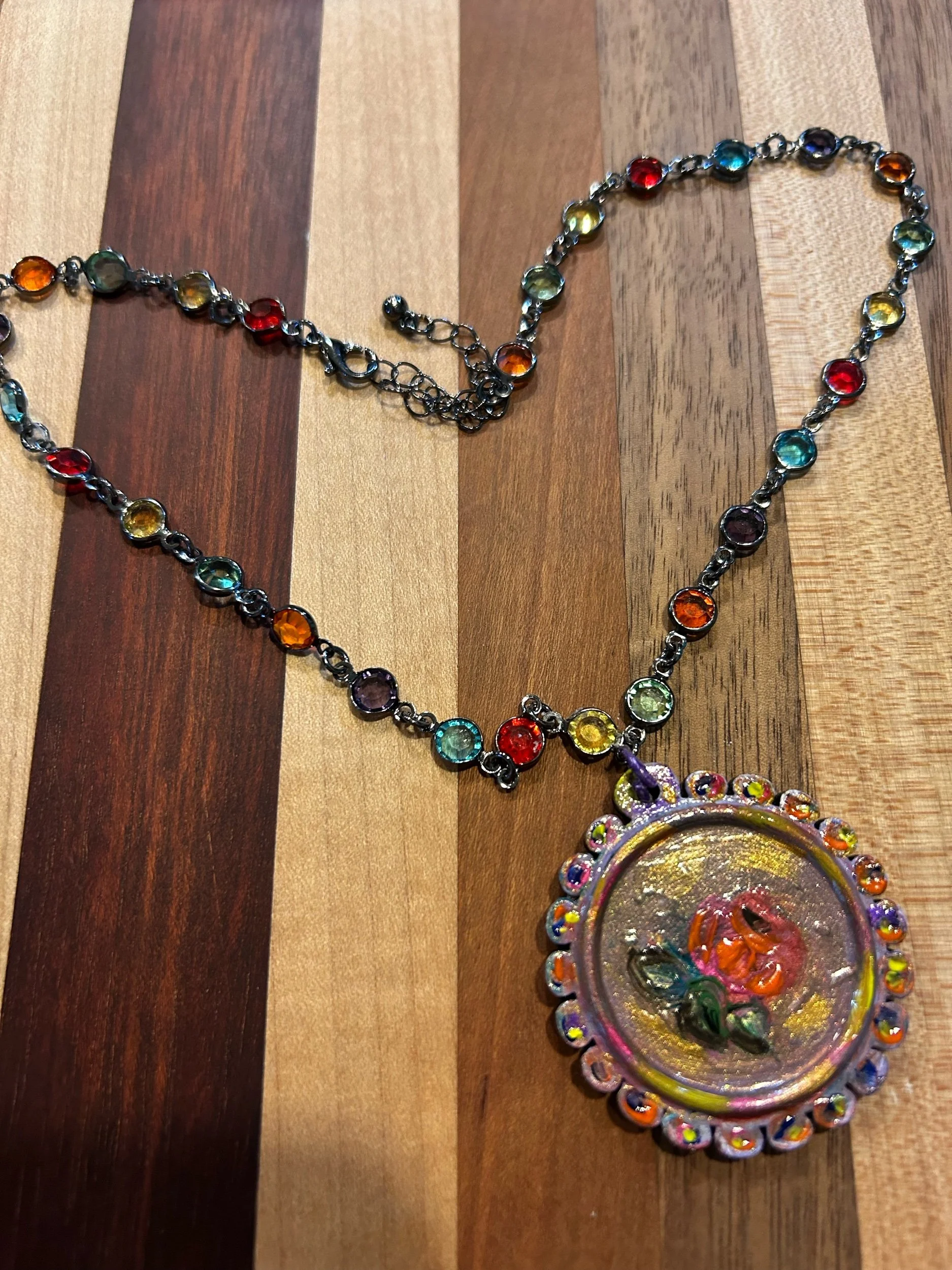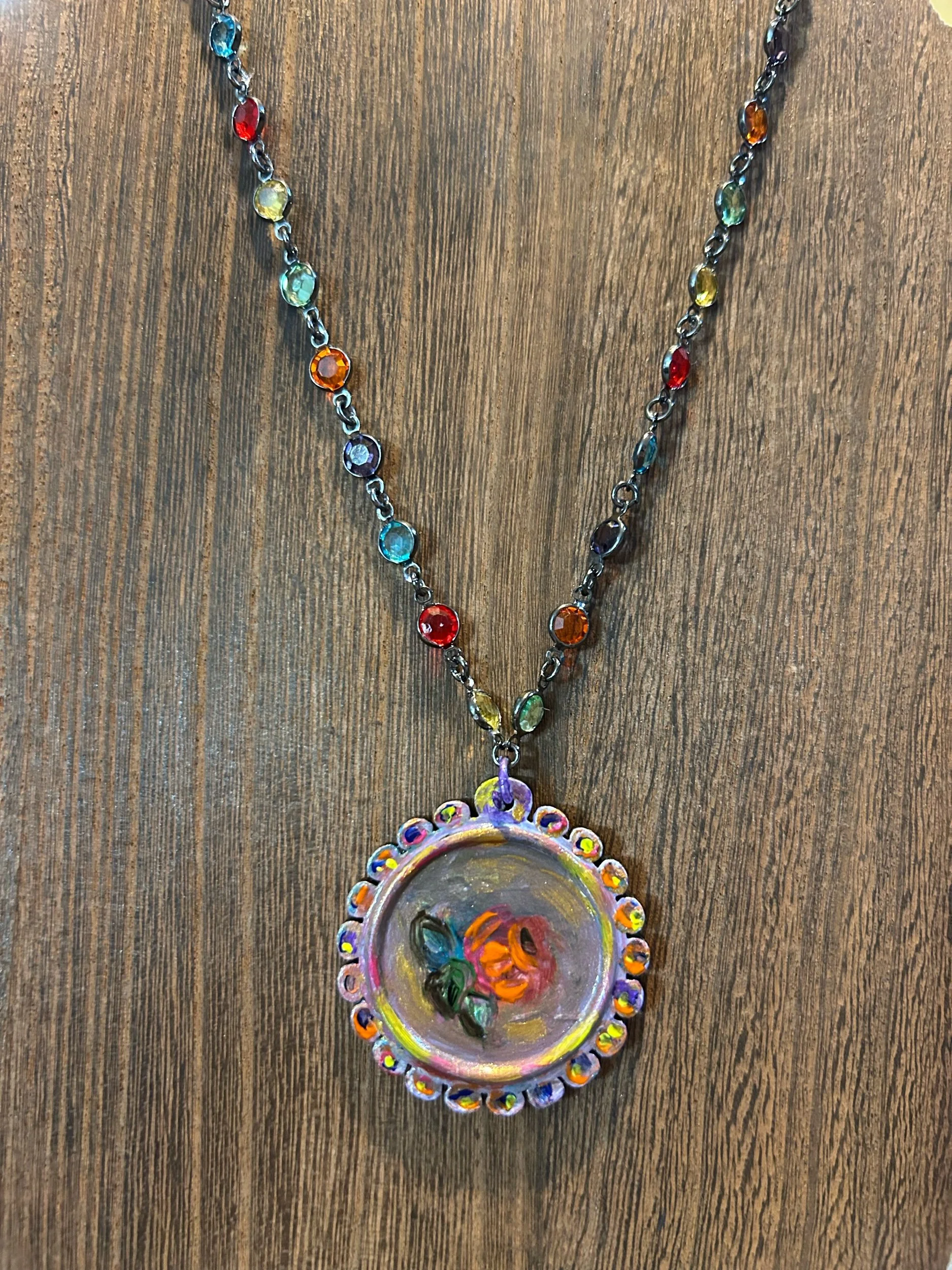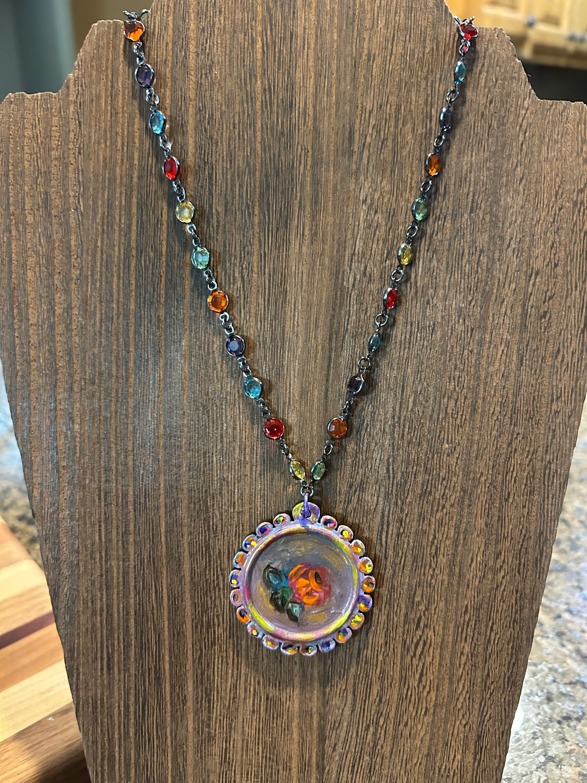 This 14” + 4” extender gemmed necklace has a hand painted wooden rose pendant painted in acrylic paint and sealed in gloss medium. Colorful and unique, comes with a complimentary hand painted water color card.
