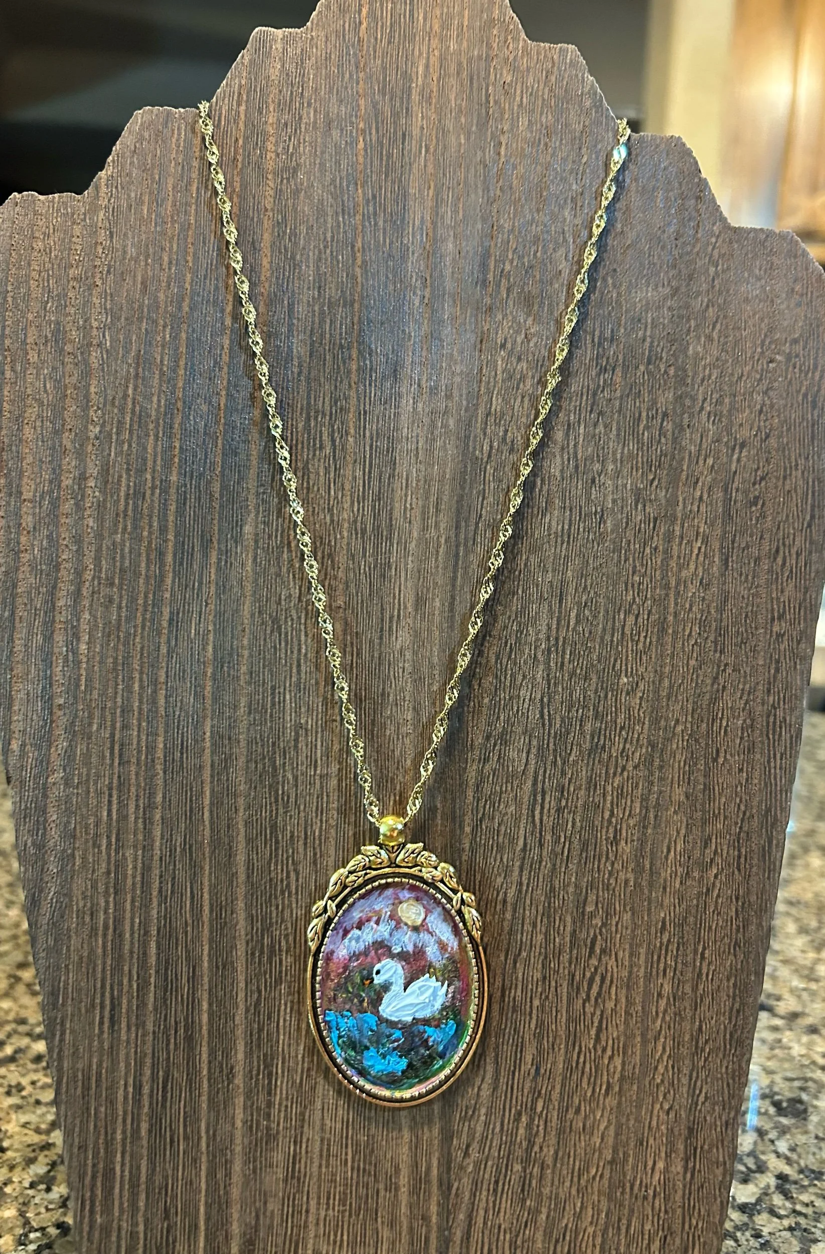 This is an 18” gold plated necklace with a hand painted duck in a pond pendant. Painted in acrylic paint and sealed in a matte medium. Charming with its cottage core theme. Comes with a complimentary hand painted water color card.