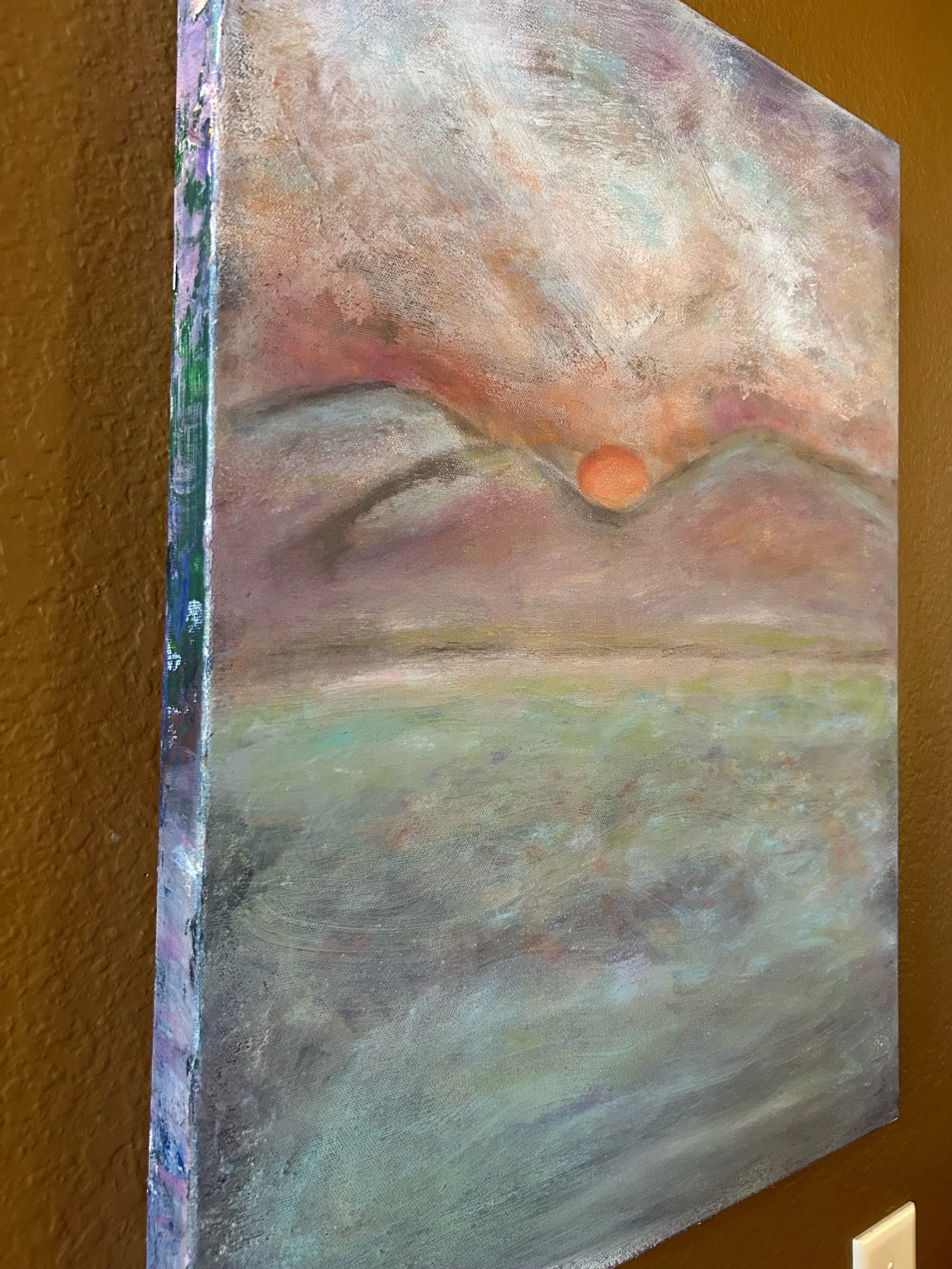 This 18” x 24” mixed media painting captures a serene, dreamlike landscape where earth, sky, and water blend in soft harmony. Layered textures and muted tones of lavender, blush, sage, and blue create depth and movement, while a glowing sun nestles between rolling hills, evoking the quiet beauty of dawn or dusk. Expressive brushwork and atmospheric color shifts invite reflection, offering a sense of calm, renewal, and connection to nature.