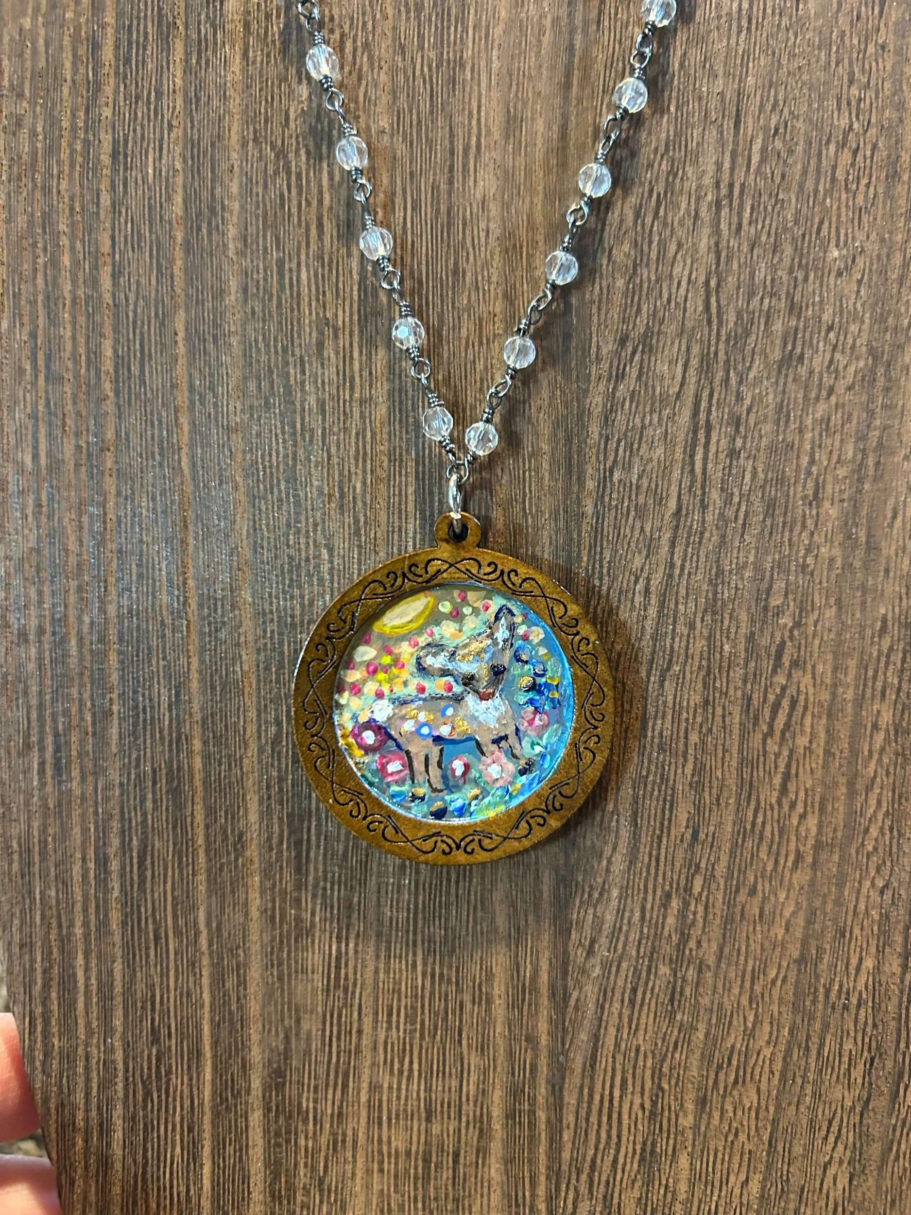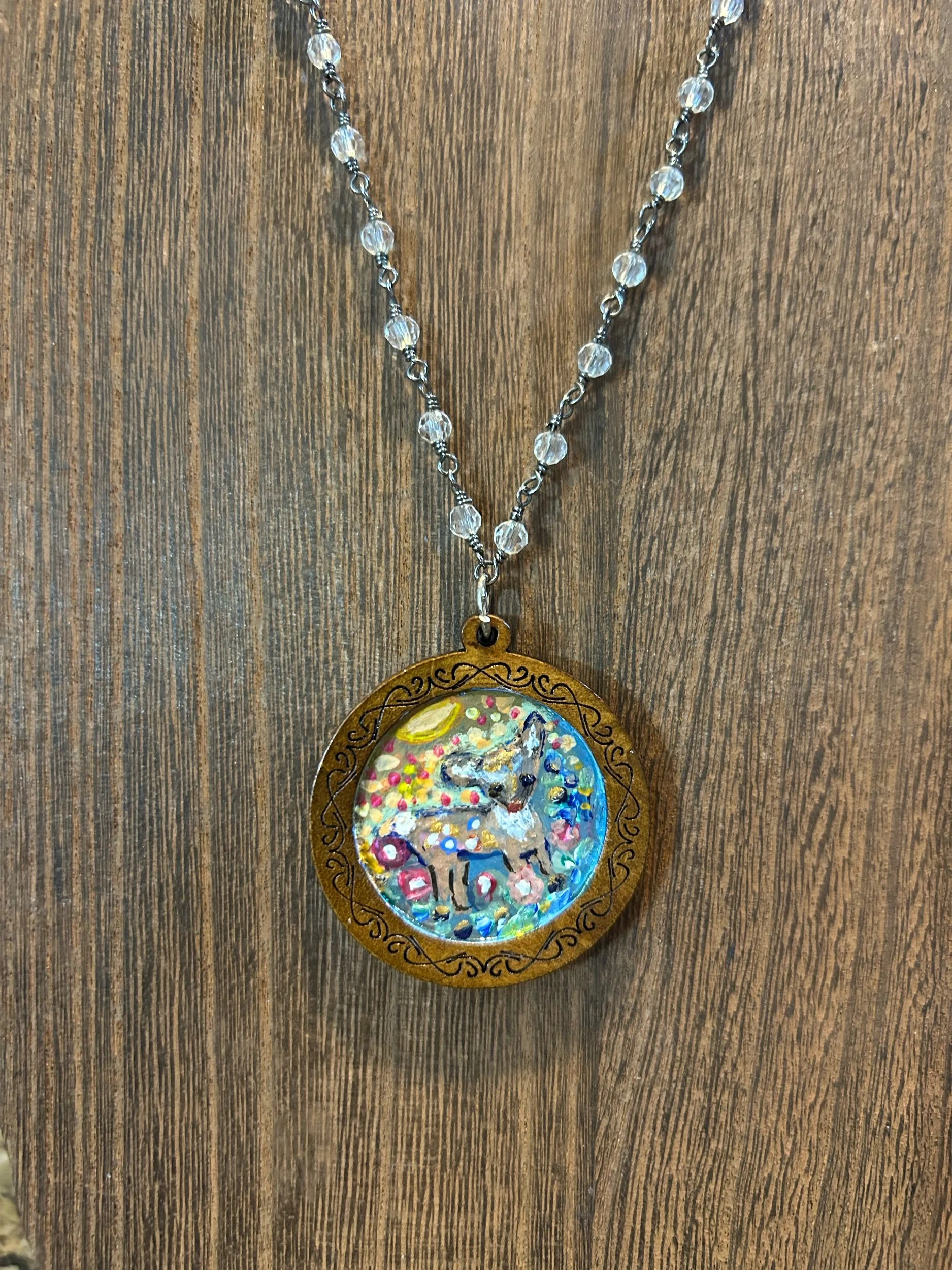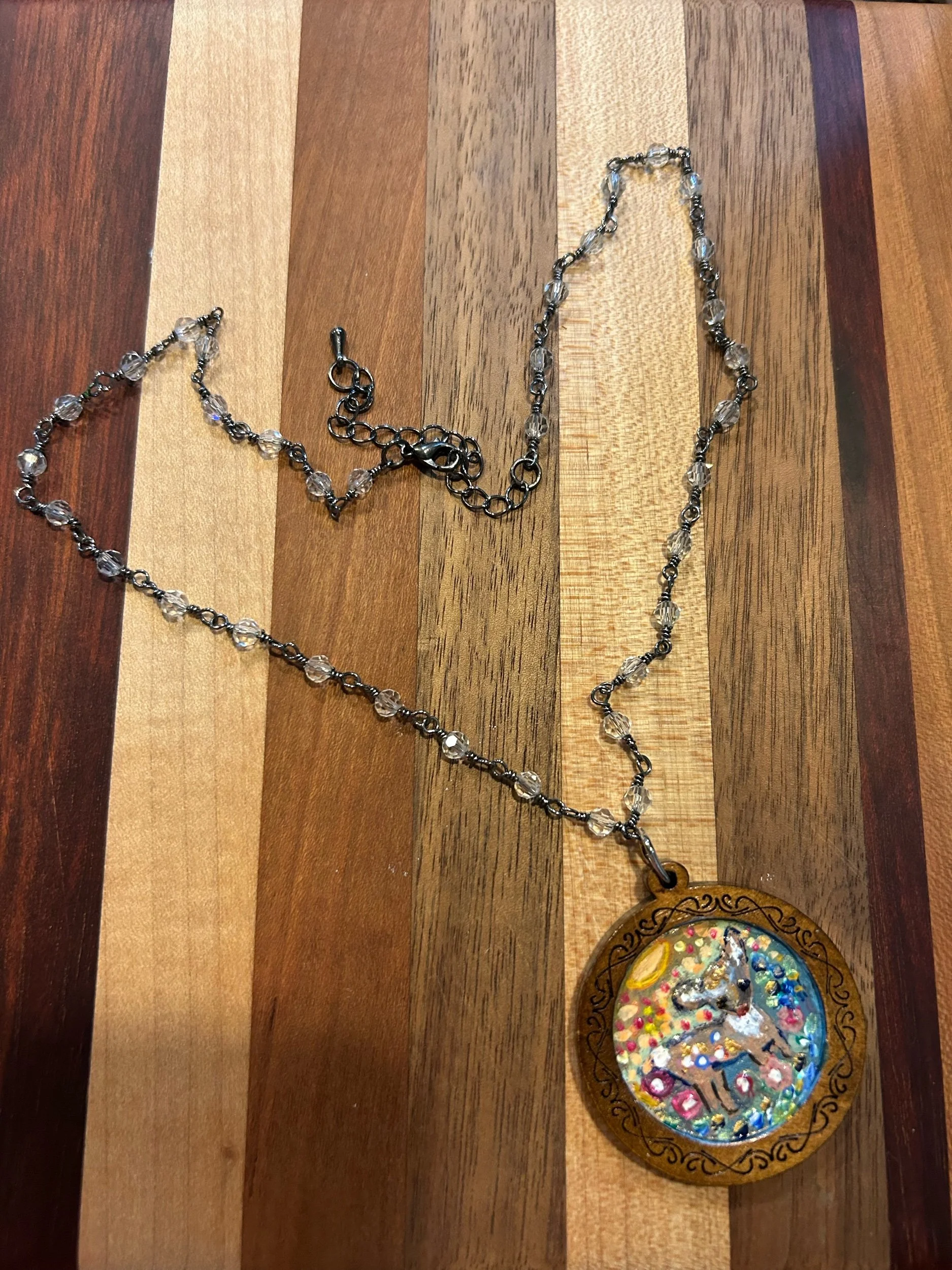This 16” + 4” extender chain beaded necklace has a wooden hand painted deer painted in acrylic paint and sealed in high gloss medium. Charming and perfect for the forest core lover. Comes with a complimentary hand painted water color card