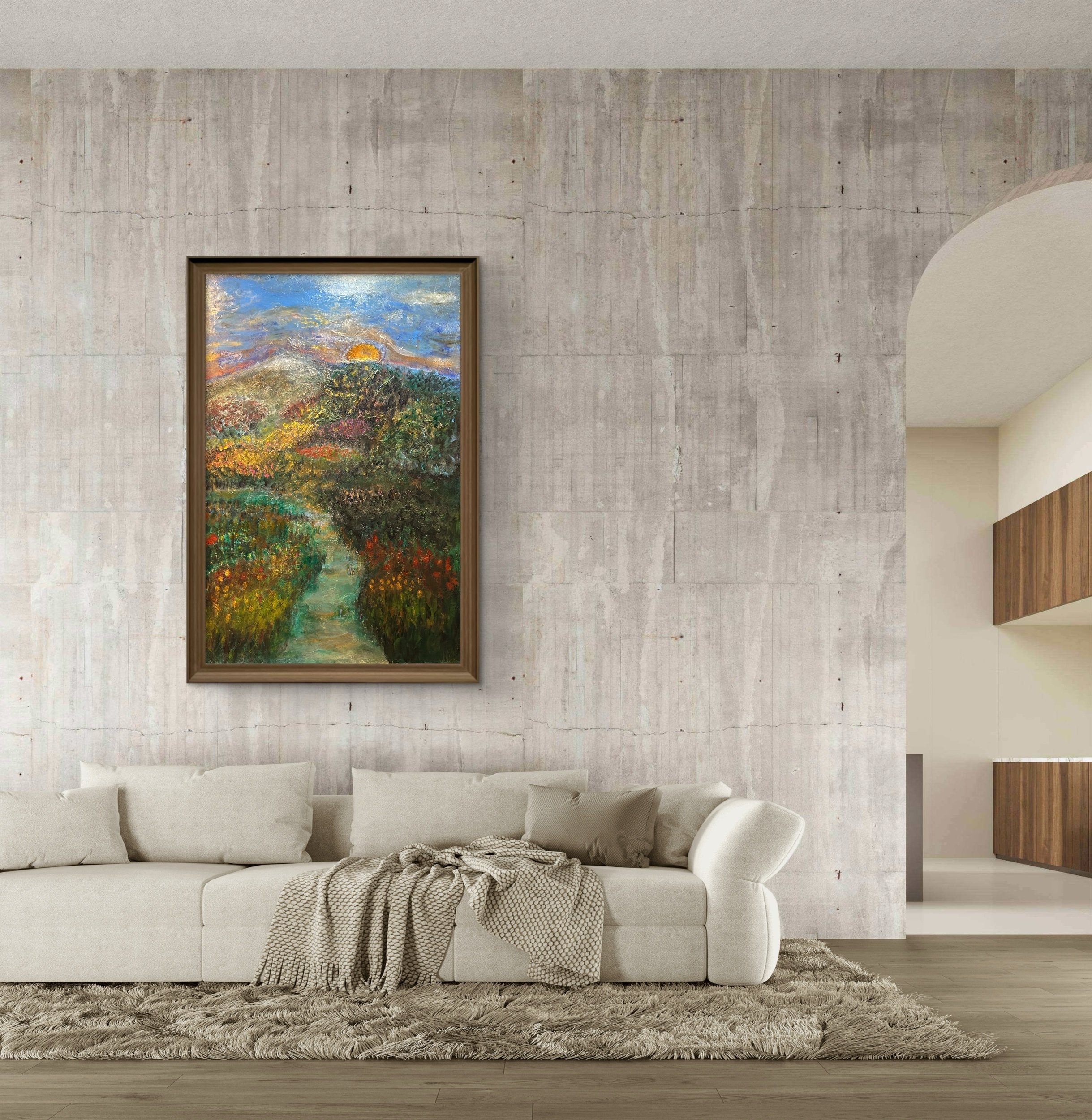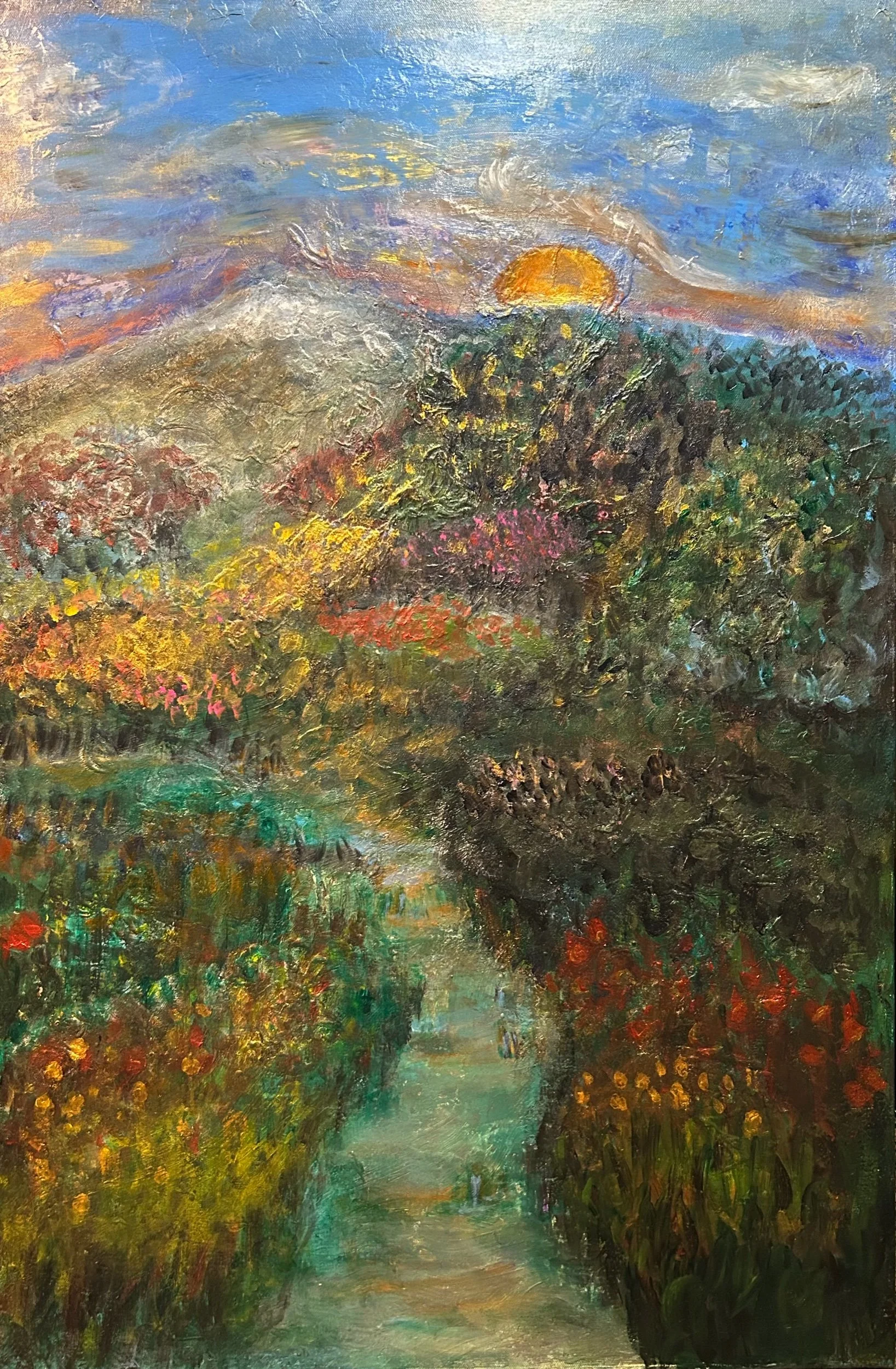 This luminous acrylic painting invites viewers into a dreamlike landscape where color, texture, and atmosphere merge into an immersive visual journey. Dense blooming gardens alive with warm reds, glowing golds, and flashes of vibrant pink and green adorn the landscape. Thick, expressive brushstrokes build a lush tapestry of foliage, giving the scene a tactile richness and a sense of natural abundance. The horizon ignites with a radiant, golden sun lifting into a sky washed with blues, violets, and gentle coral tones, its light spreading across distant hills and shimmering through the textured clouds. The composition conveys both movement and serenity—an impressionistic celebration of renewal, warmth, and the quiet wonder of walking toward the first light of day.