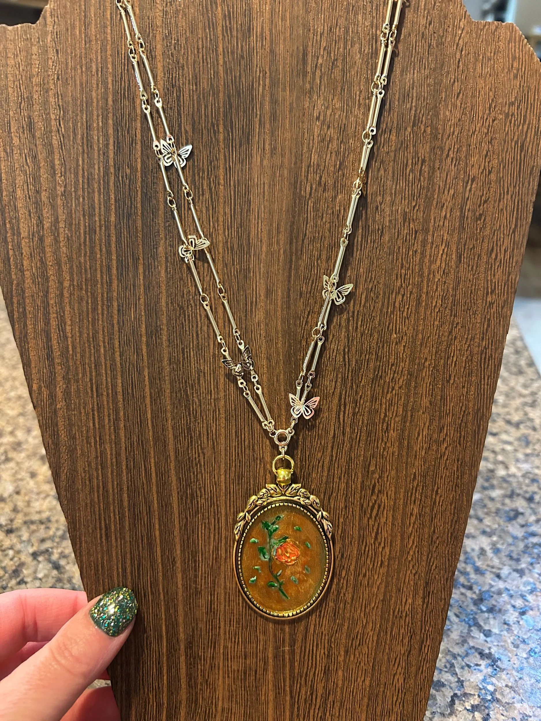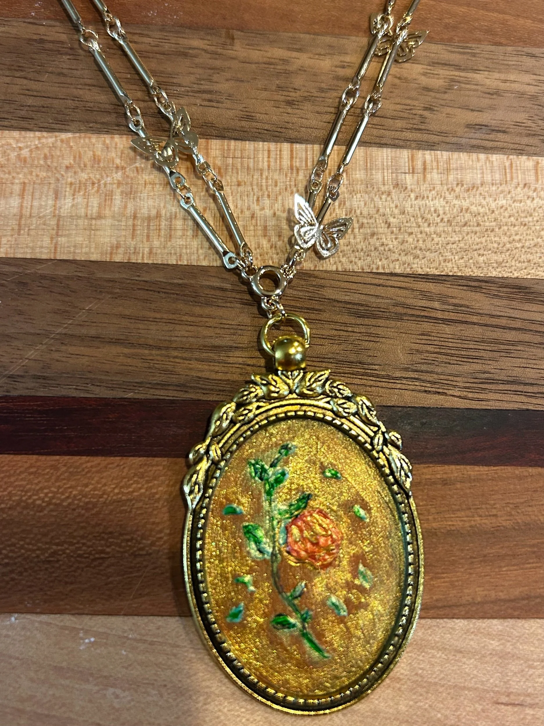 18” gold plaited butterfly necklace, nickel free with hand painted “enchanted” rose pendant. Painted with acrylic rose, golds and greens, this unique necklace is full of magic and romance. Sealed with high gloss medium. Comes with a complimentary hand painted water colored card.
