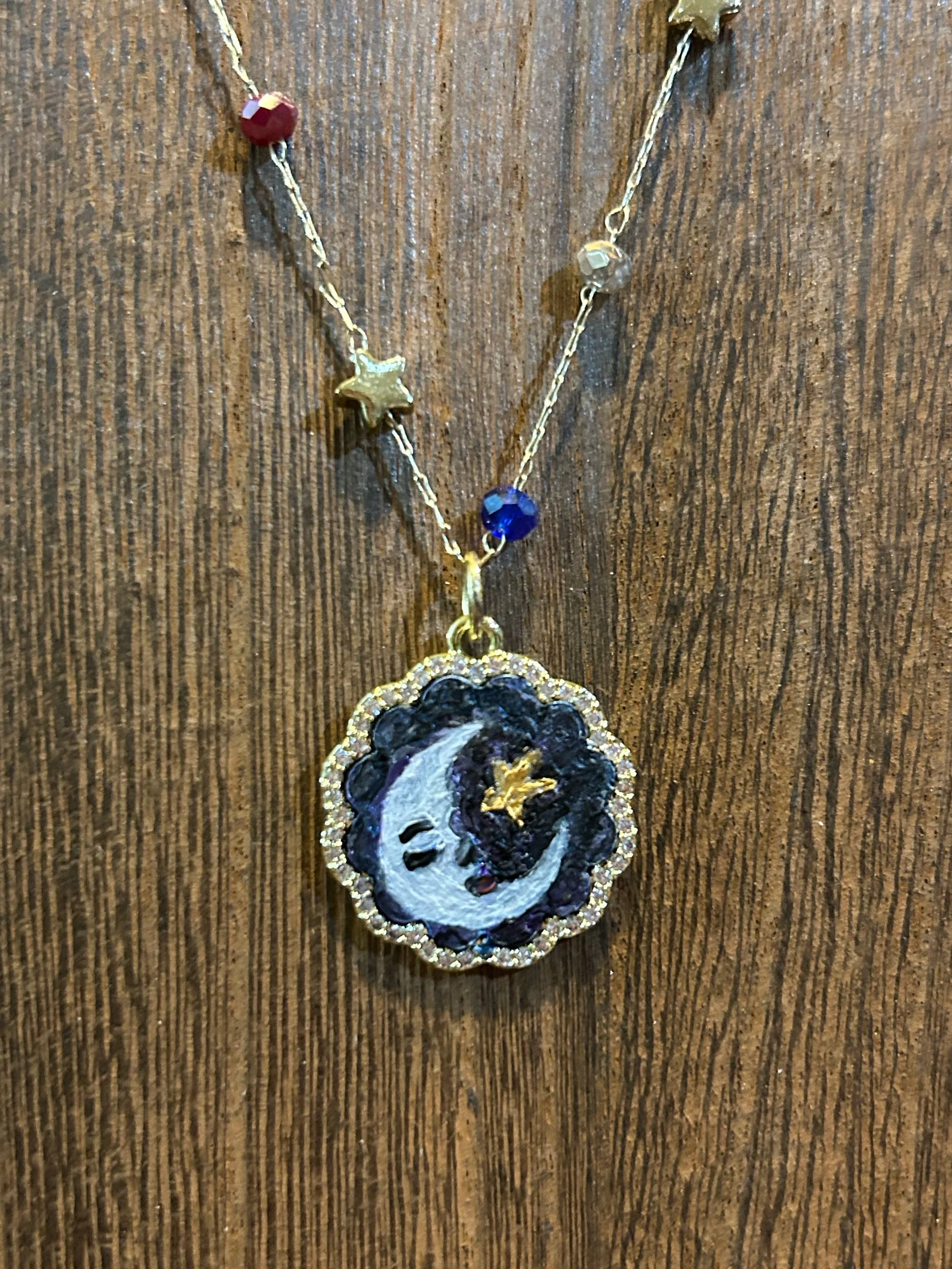 This 18” moon and star pendant necklace is hand painted with acrylic paint and sealed in high gloss medium. Comes with a complimentary hand painted water color card.
