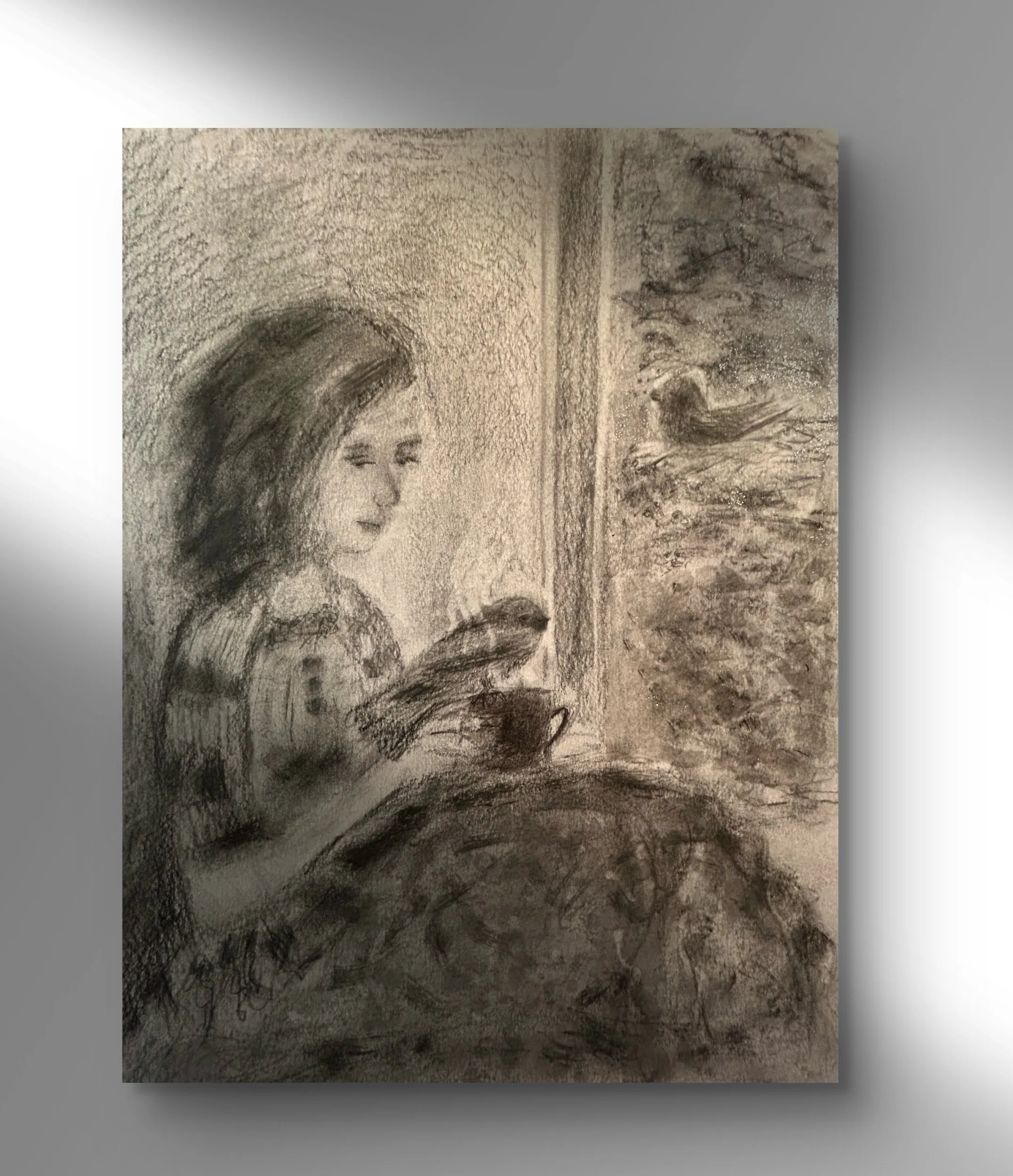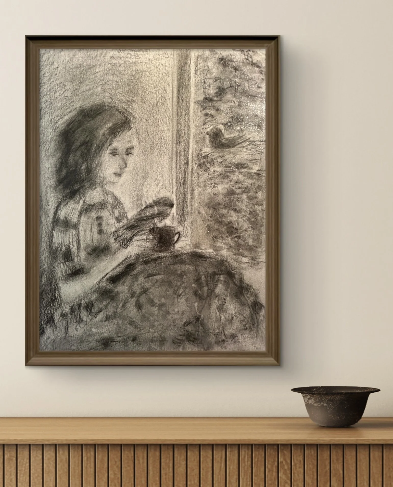 This intimate charcoal drawing captures a quiet, contemplative moment suspended in time. The composition is hushed and atmospheric, built from layered charcoal textures that blur the boundary between figure and space. Loose, expressive marks suggest rather than define. The restrained palette of warm grays and deep charcoals creates a sense of nostalgia and calm, evoking solitude, warmth, and the quiet ritual of a private moment.
