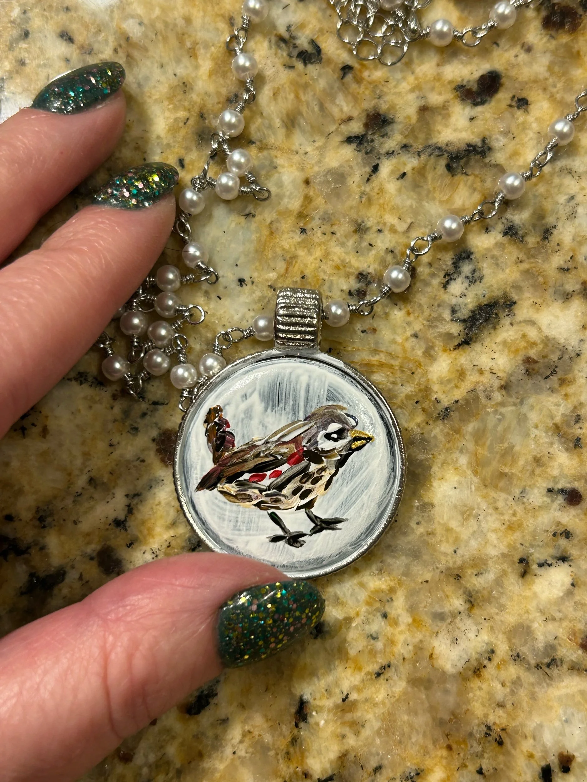 This 14” + 4” extender chain necklace, nickel free, comes with a hand painted bird pendant. Painted in acrylic paint and sealed in high gloss medium. Comes with a complimentary hand painted water color card.