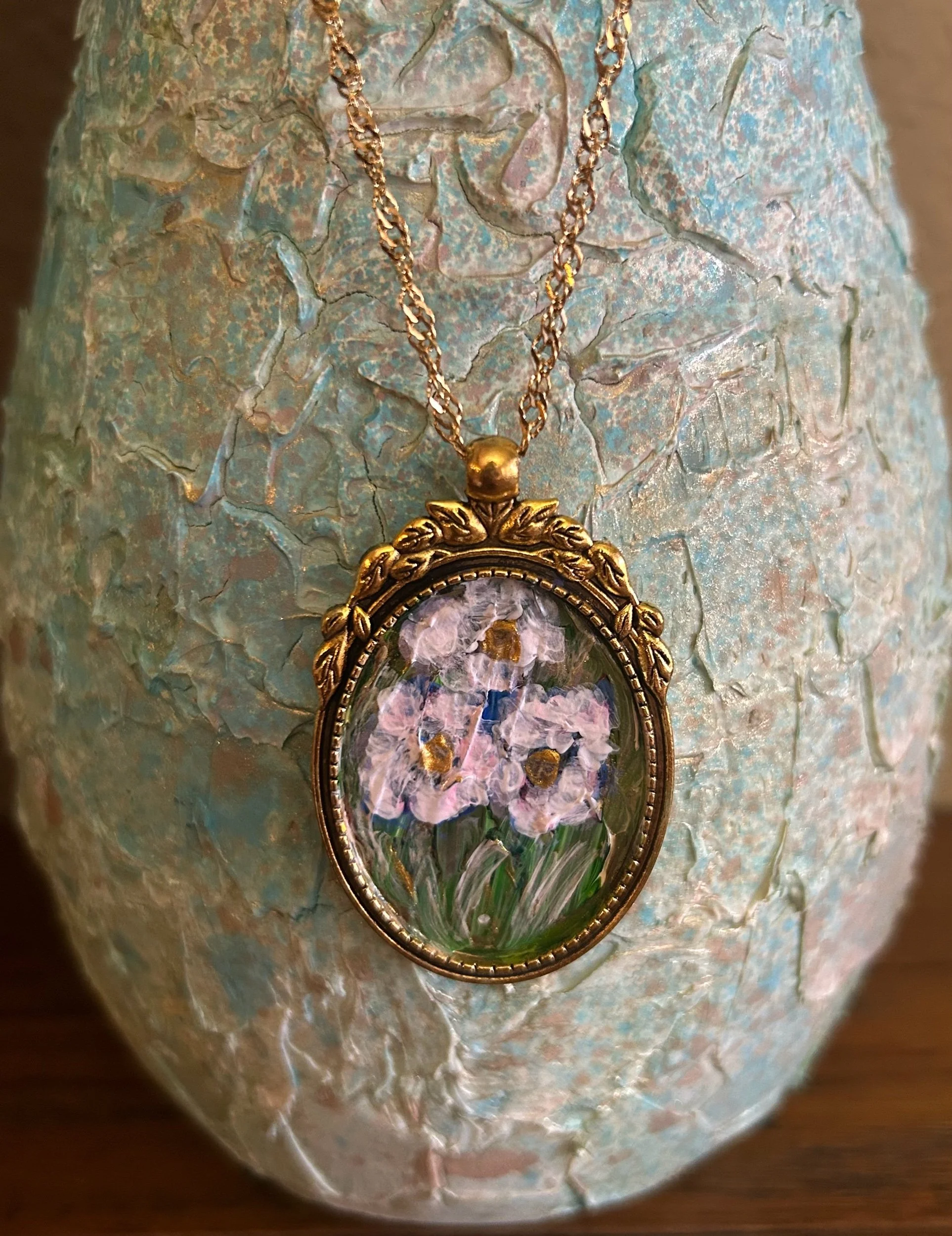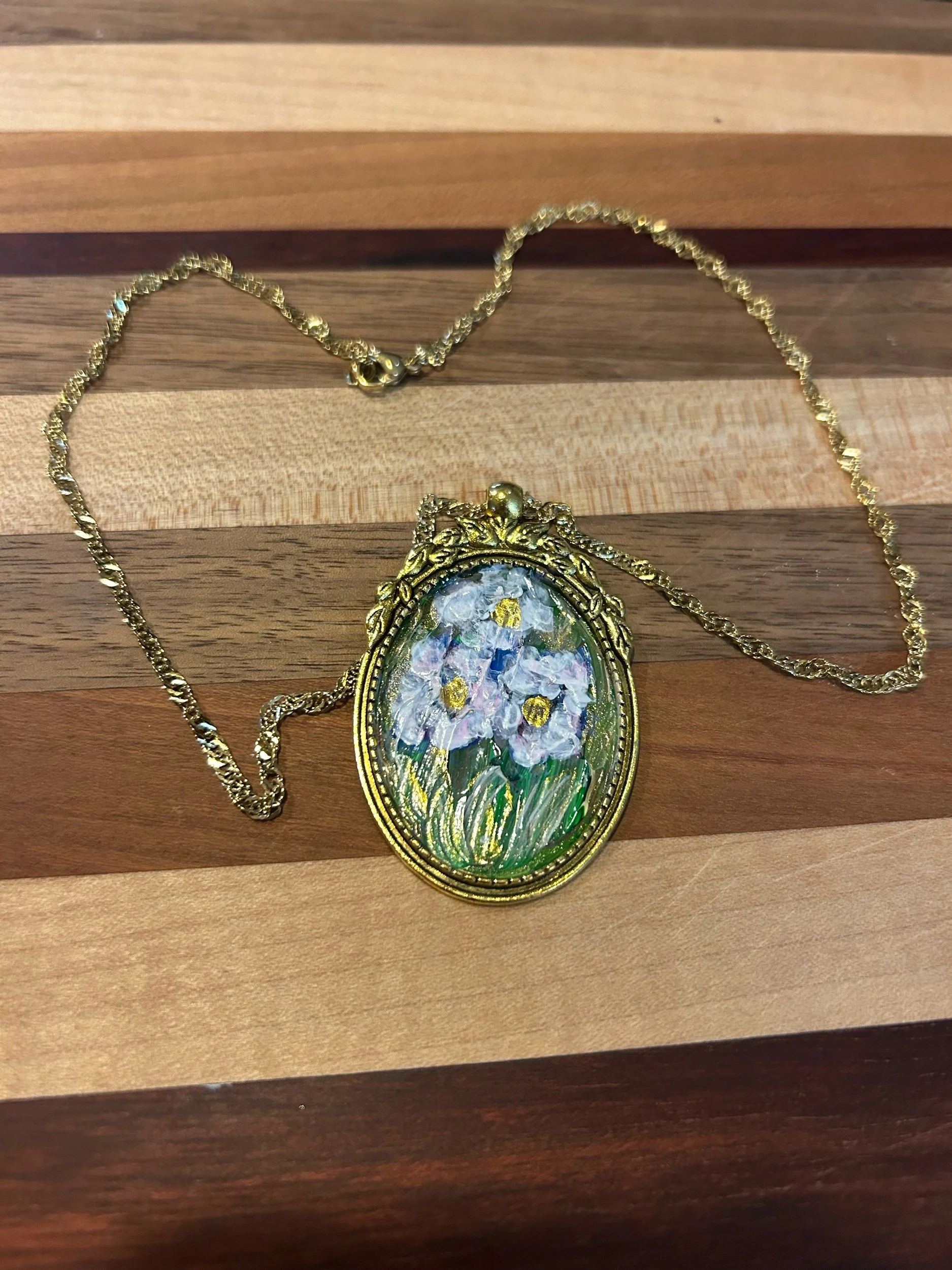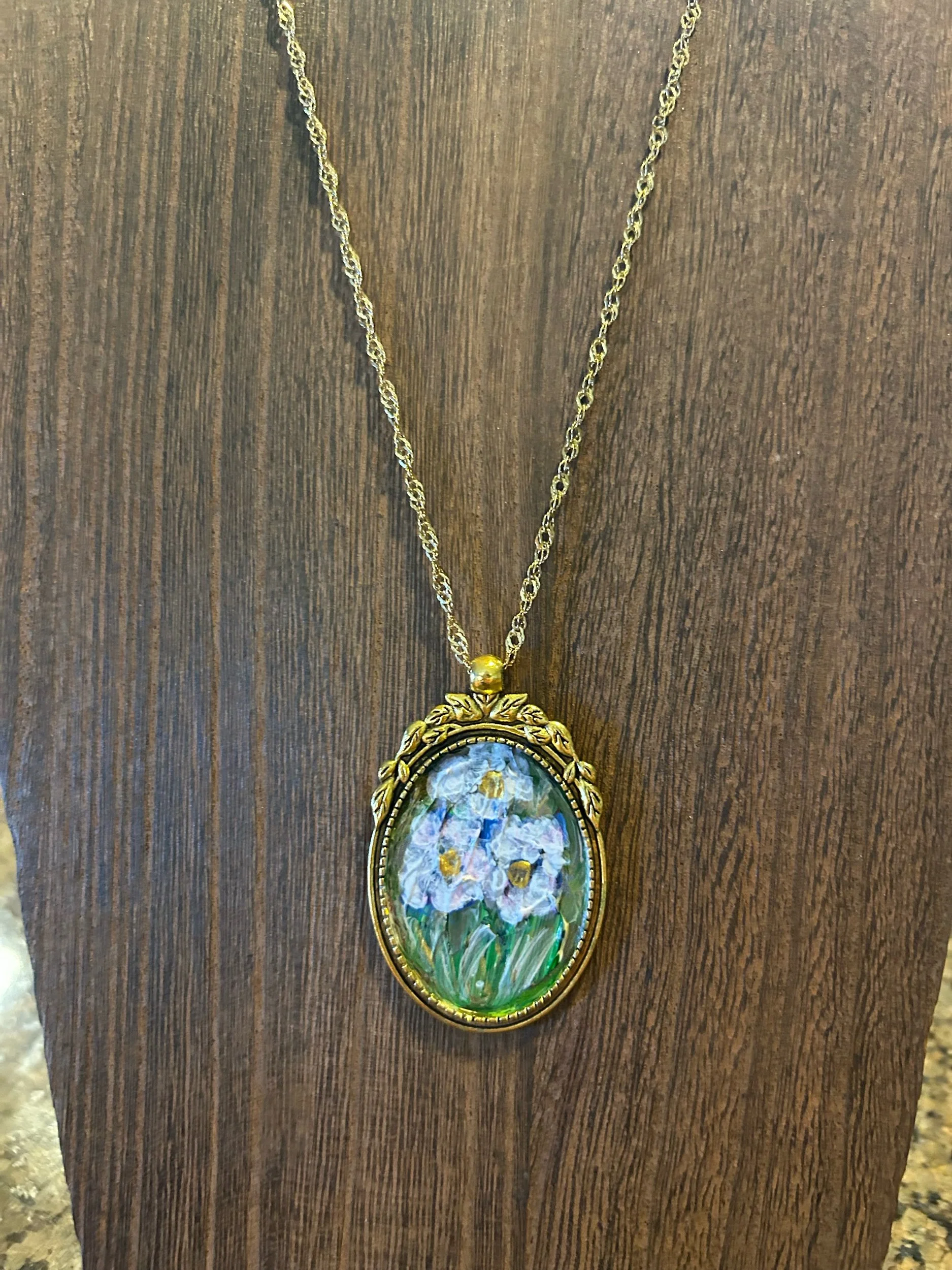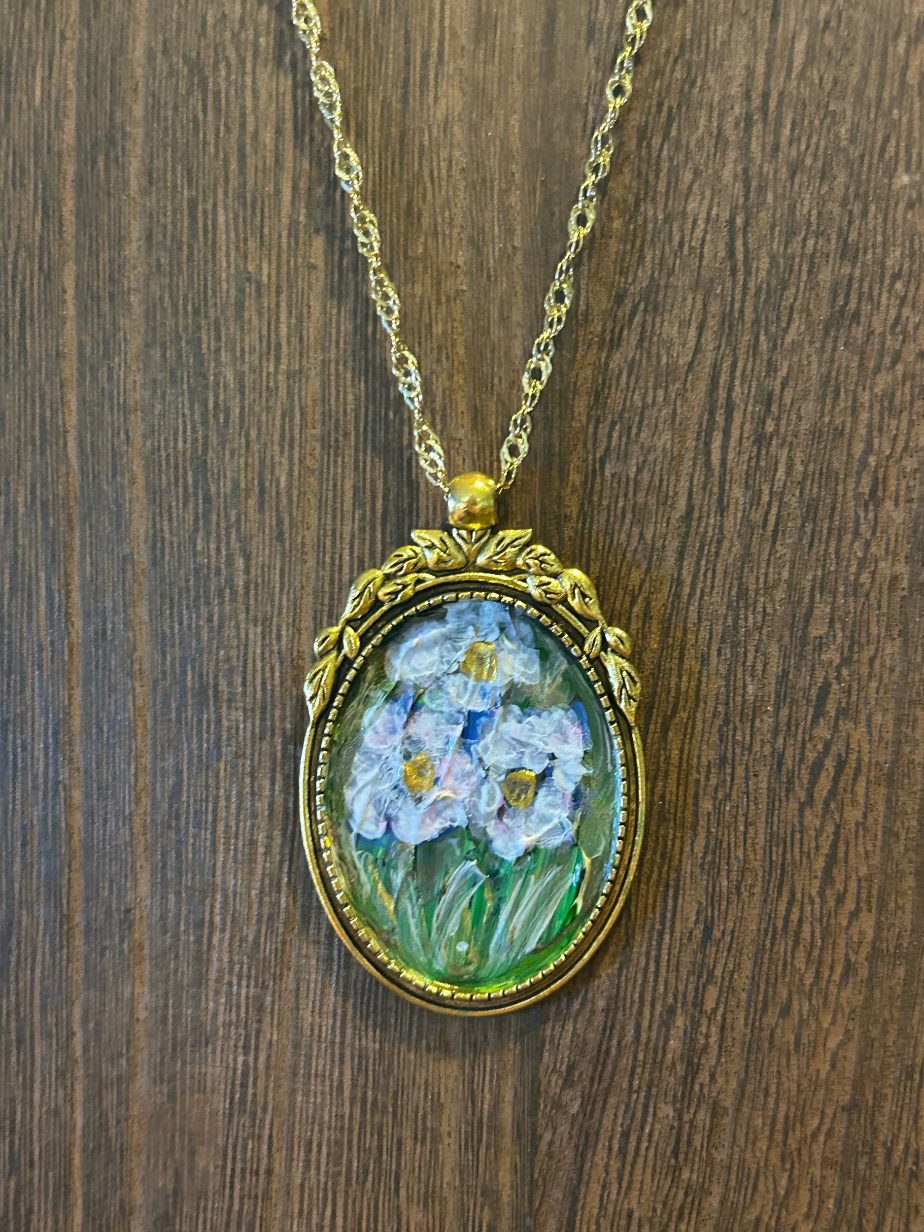This 18” gold plated necklace with hand painted white flower pendant is created with acrylic and sealed in matte medium. Comes with a complimentary hand painted water color card!