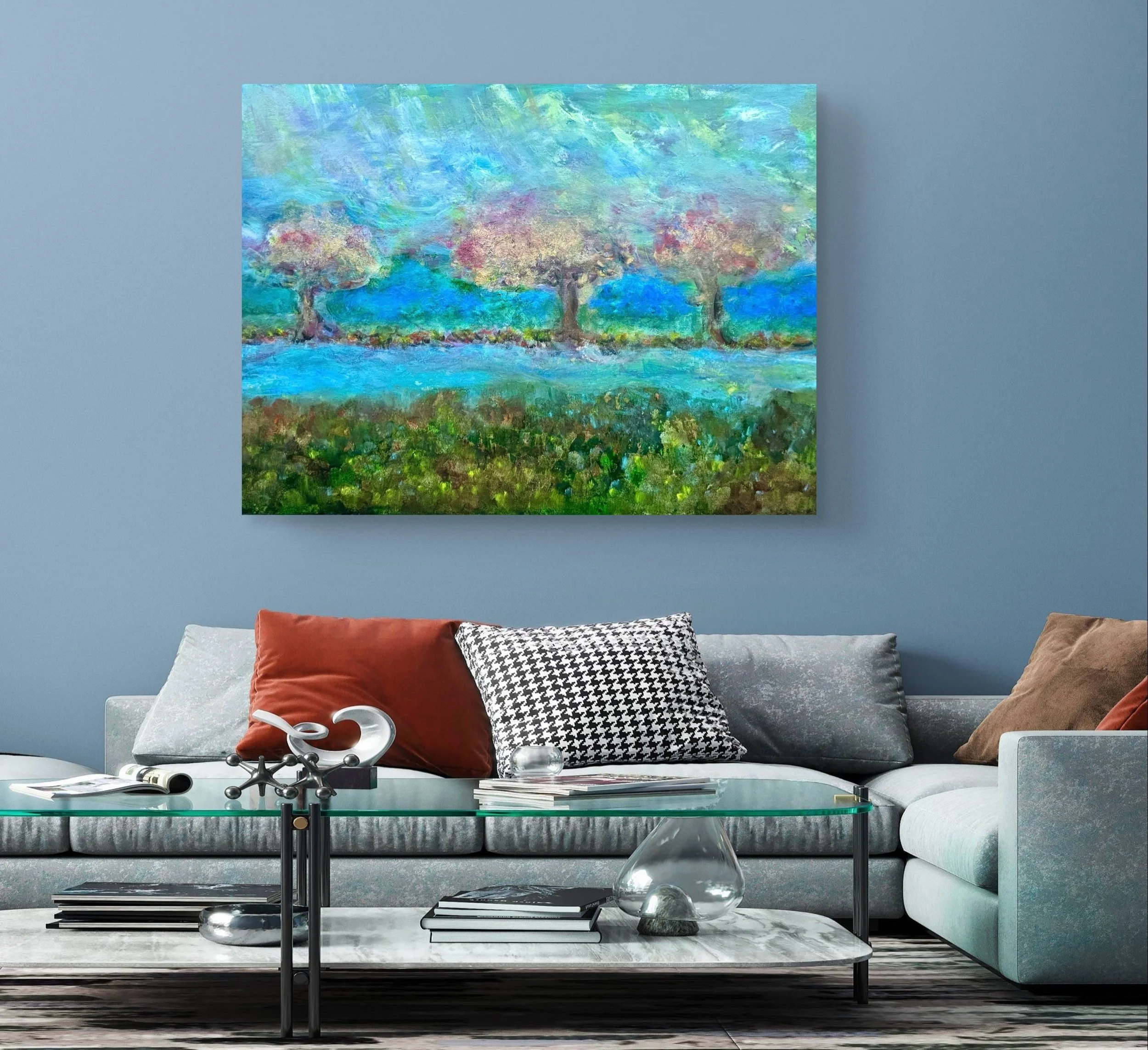 Autumn Breeze unfolds as a serene impressionist landscape awash in hues of turquoise, aqua, and soft gold. Three luminous trees, brushed with whispers of rose, lavender, and ochre, stand in quiet harmony along a tranquil stream. The artist’s layered textures and sweeping strokes evoke the shimmer of sunlight filtering through mist, lending the scene a dreamlike rhythm. Beneath, dappled greens and earth tones hint at a meadow in bloom, while the distant blue horizon melts seamlessly into the ethereal sky. This painting radiates peace and renewal—an invitation to pause and breathe within nature’s gentle poetry.
