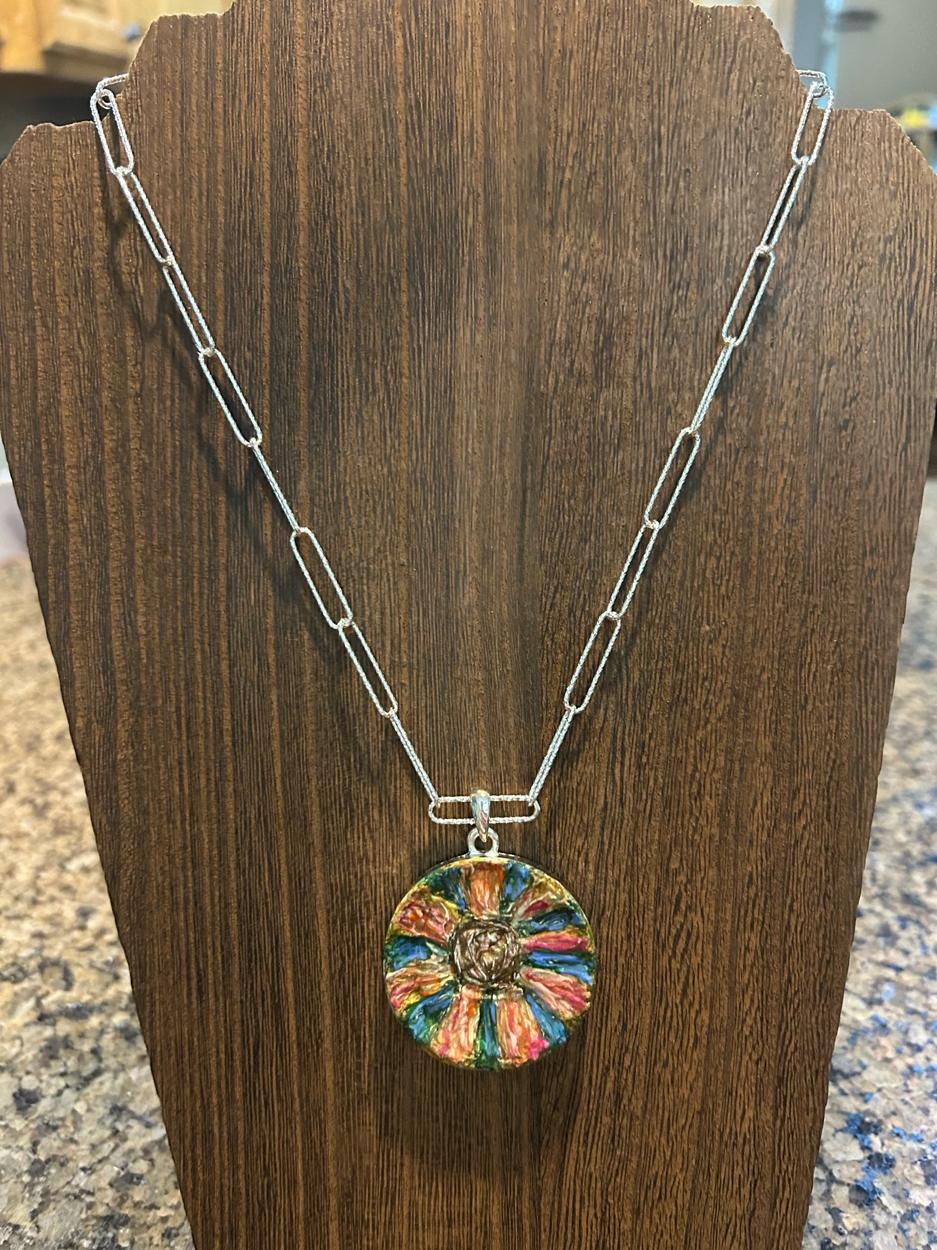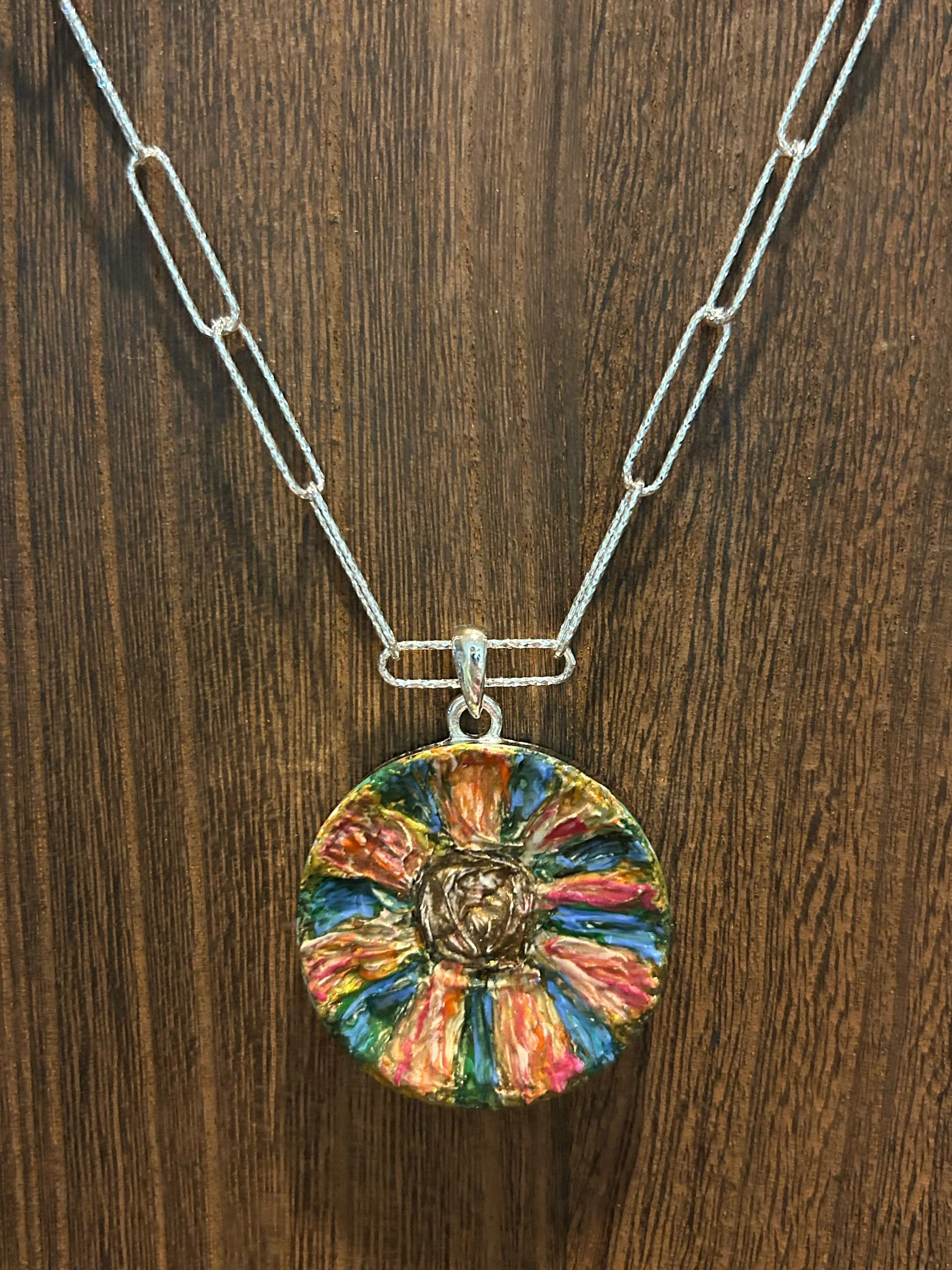This 18” silver plated nickel free hand painted flower pendant necklace is created with modeling paste, acrylic paint and fairy dust. 🤗 Sealed in glossy medium. Comes with a complimentary hand painted water color card.