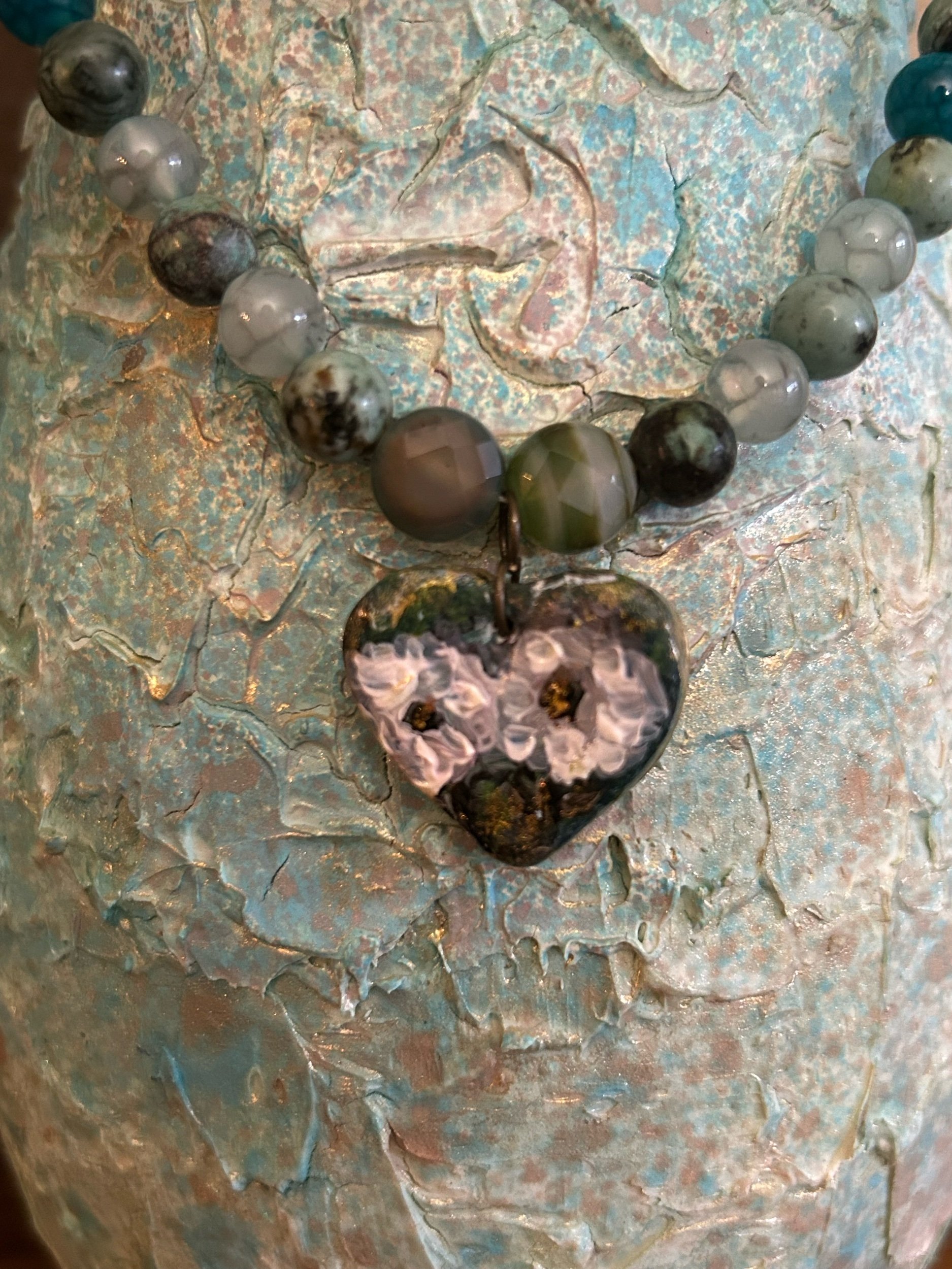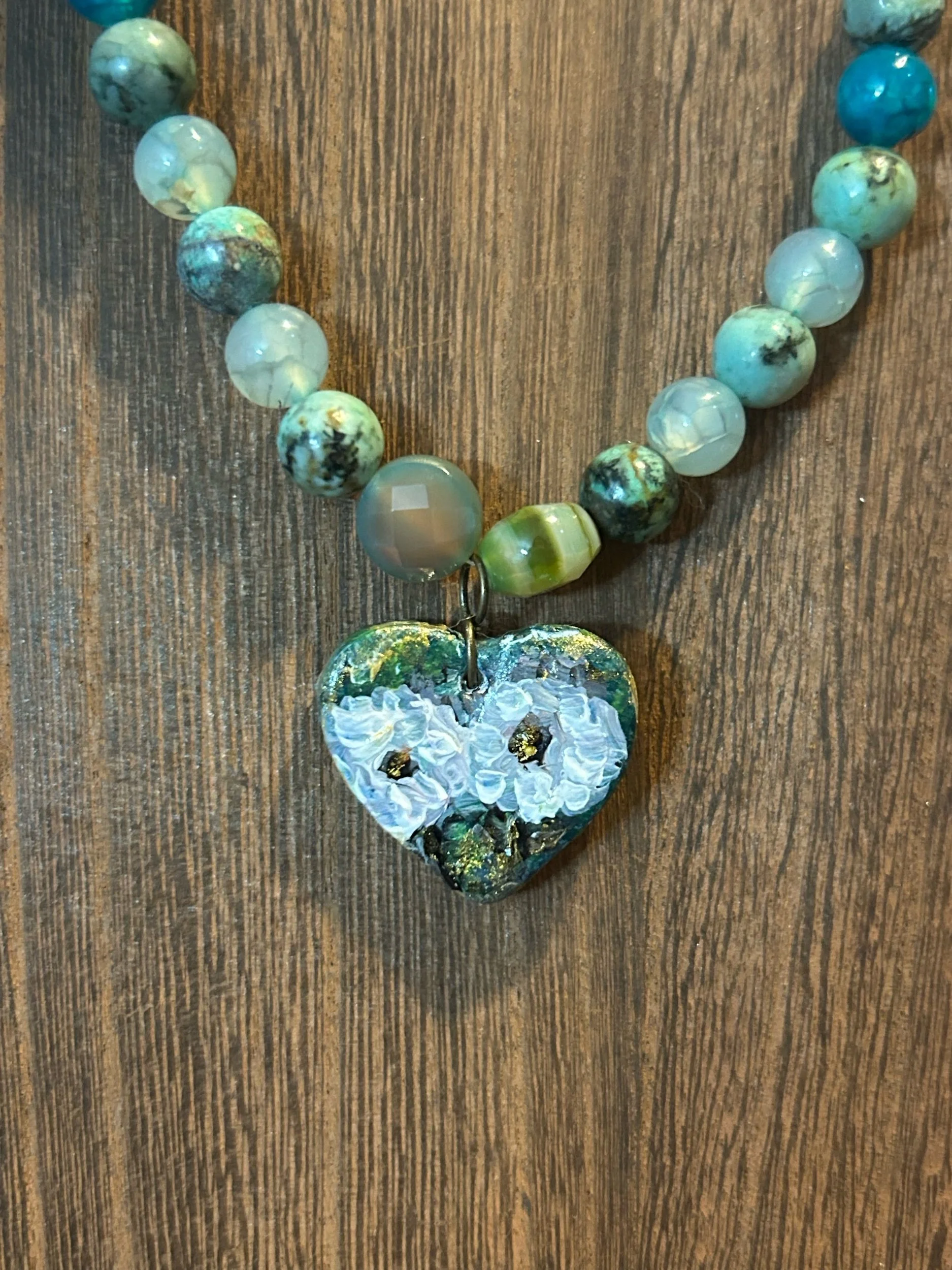 This 16” hand strung beaded necklace comes with gold extender and features a hand cut clay pendant hand painted in acrylic and sealed in matte medium. Comes with a complimentary hand painted water color card.