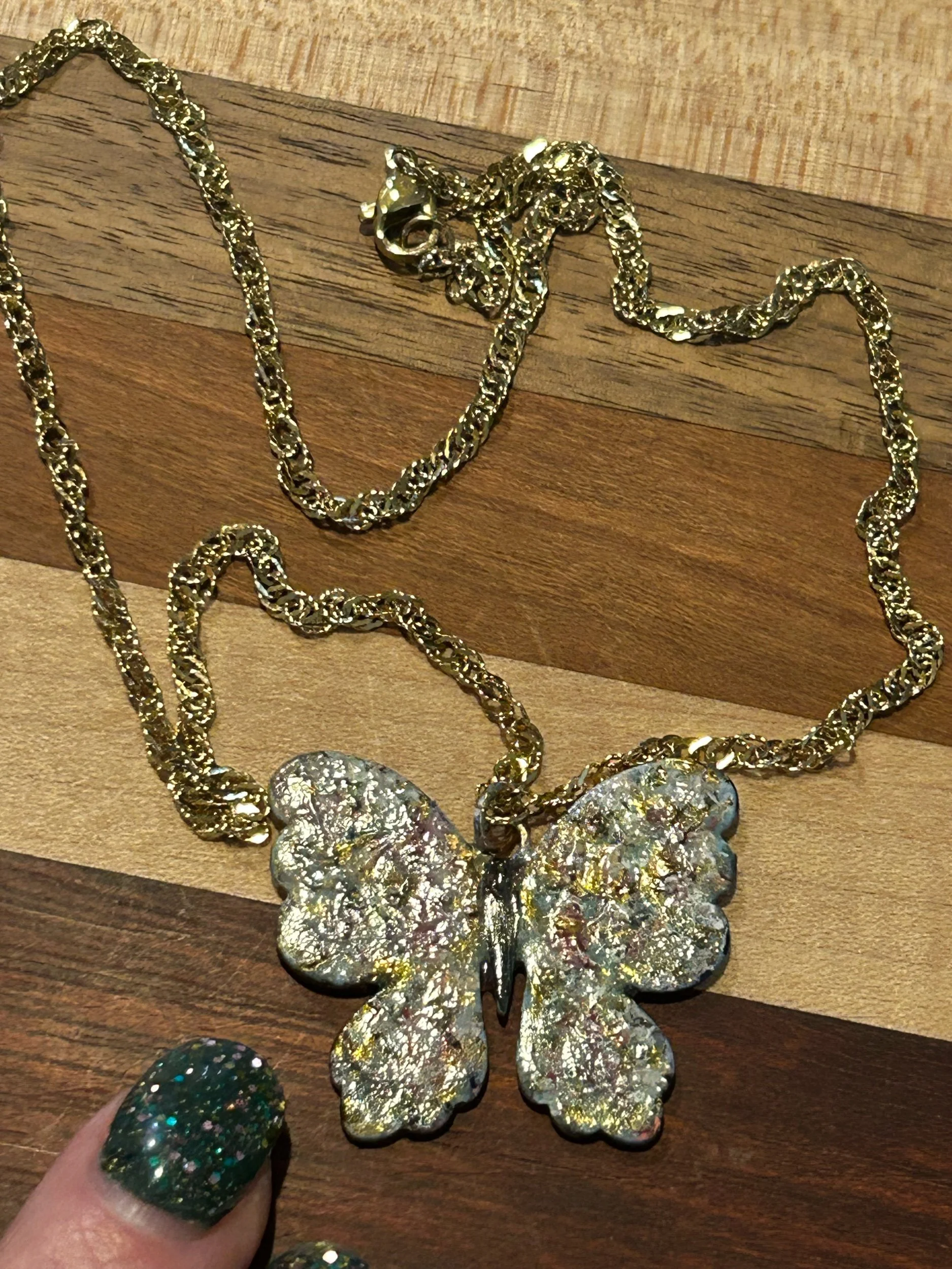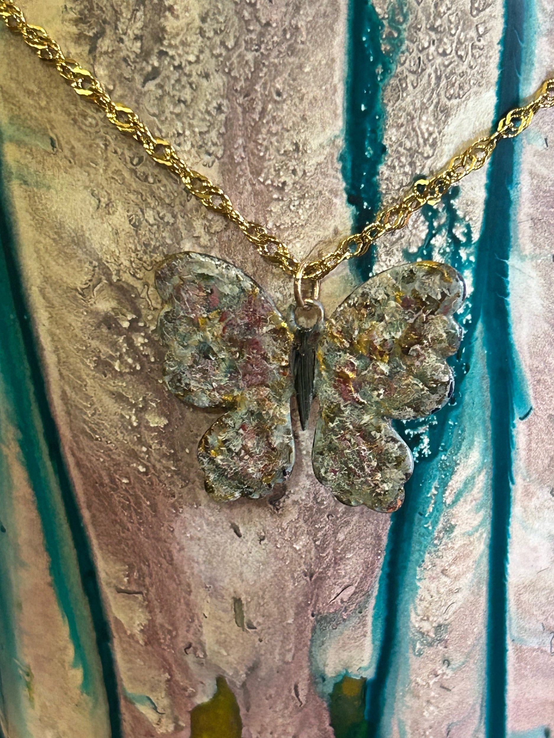 This 18” gold plated necklace has a hand painted butterfly pendant created in acrylic and sealed in matte medium. Comes with a complimentary hand painted water color card.