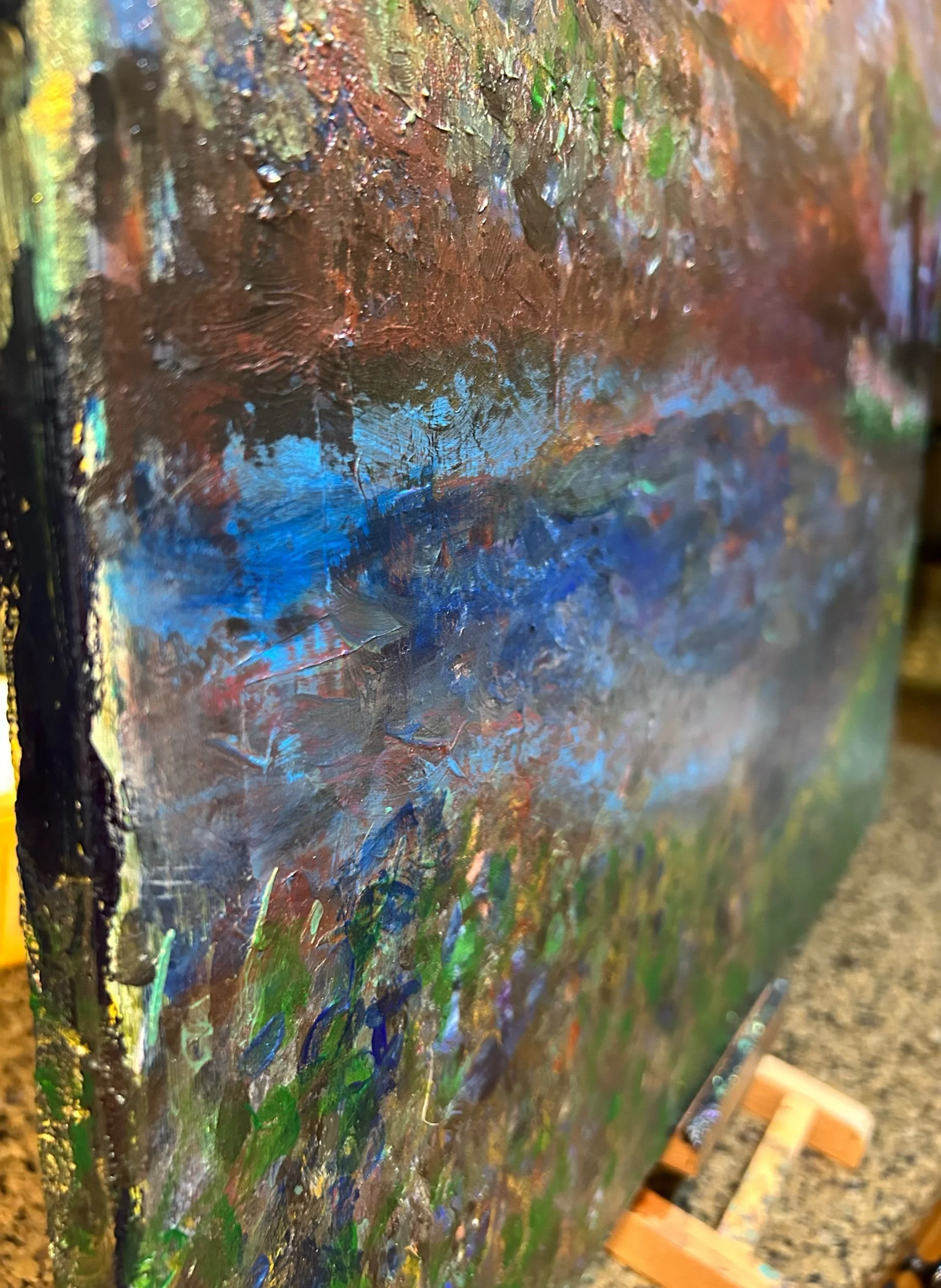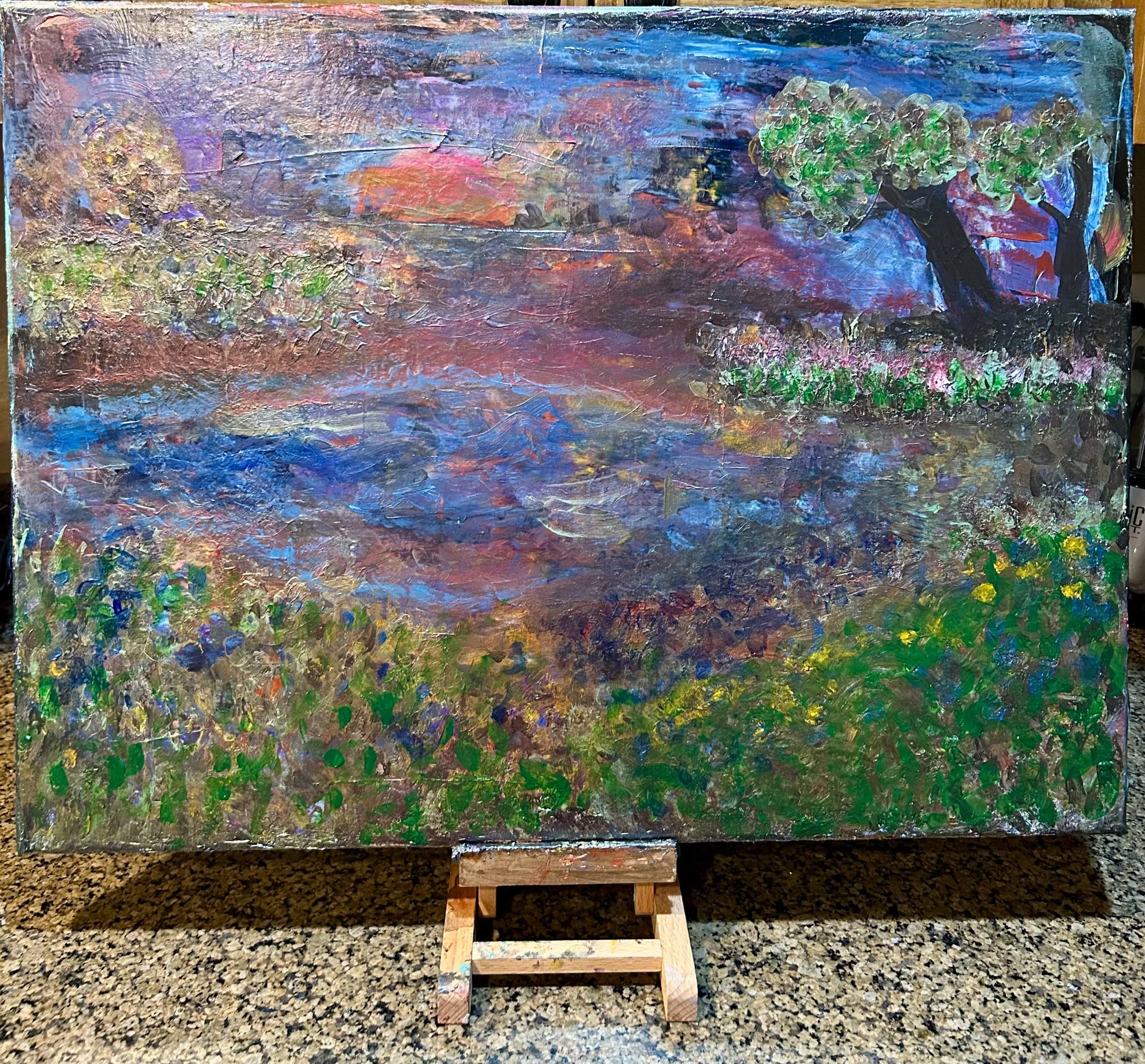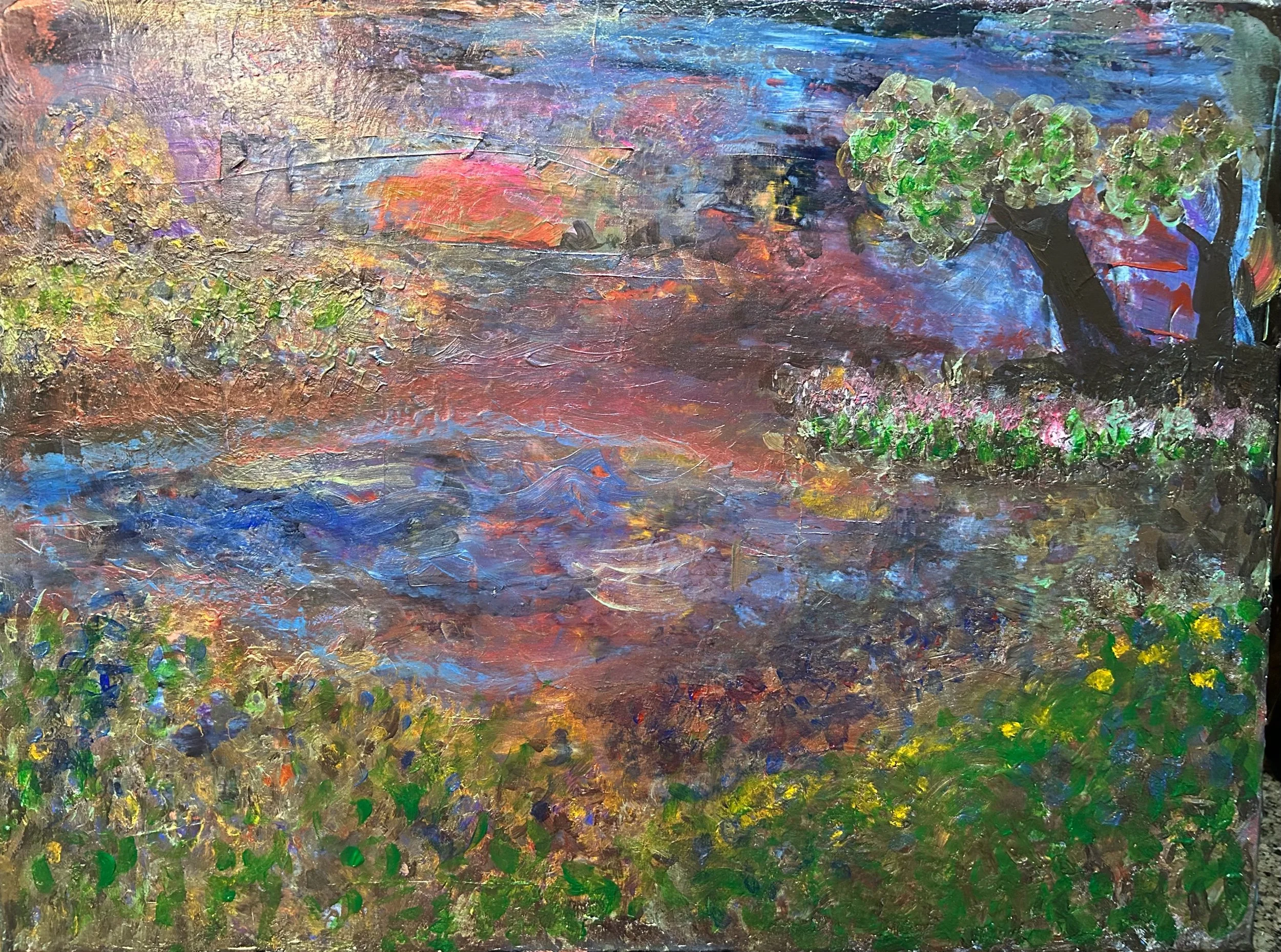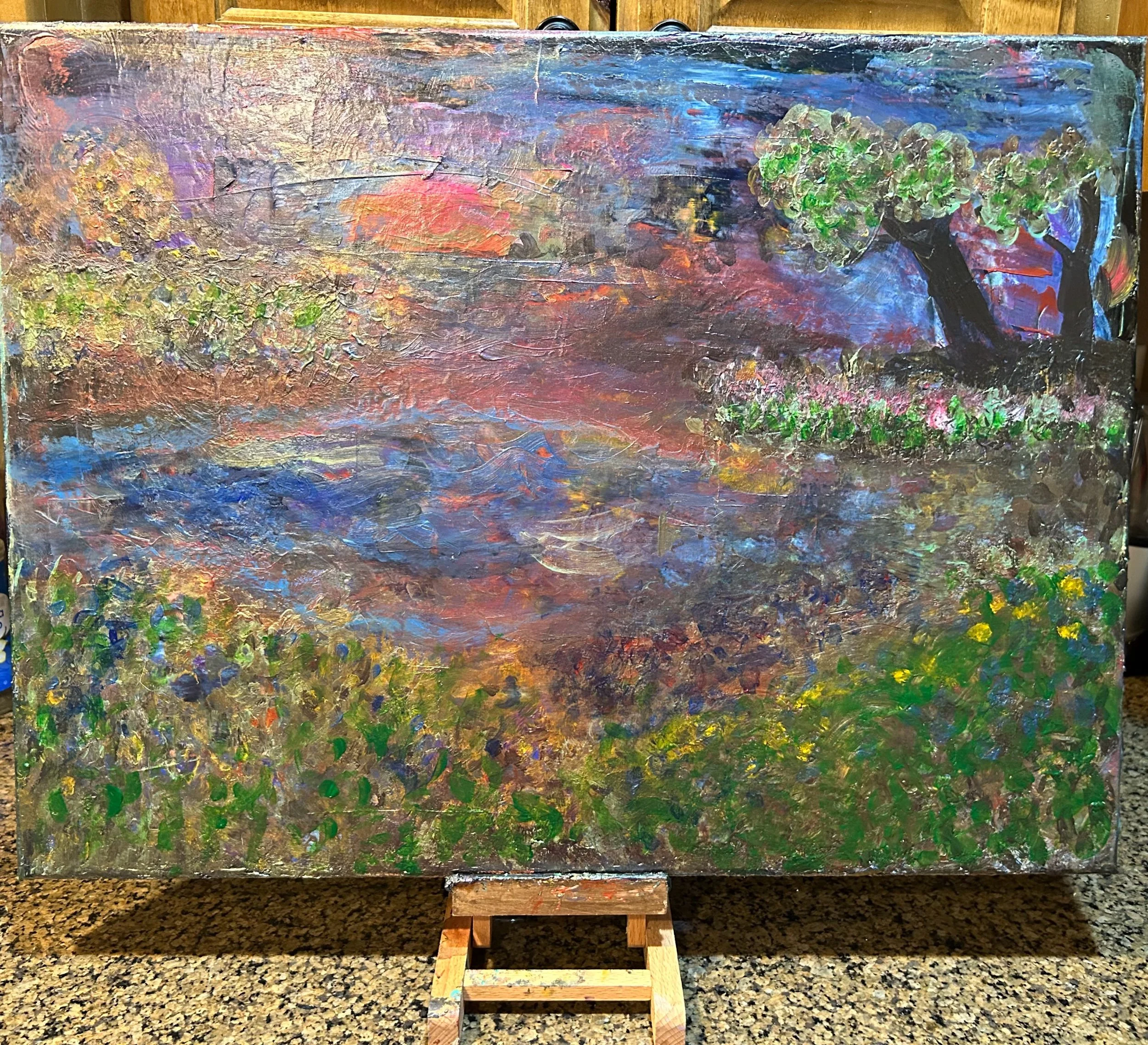 On the right, a pair of loosely rendered trees anchor the scene, their foliage dappled in vibrant greens and hints of light, as if catching the last shimmer of day. Beneath them, a suggestion of wildflowers and grasses emerges through thick, tactile paint, adding depth and movement to the foreground. The land gently rolls toward a central waterway or open field, where colors melt into one another, evoking reflection, motion, and memory.
