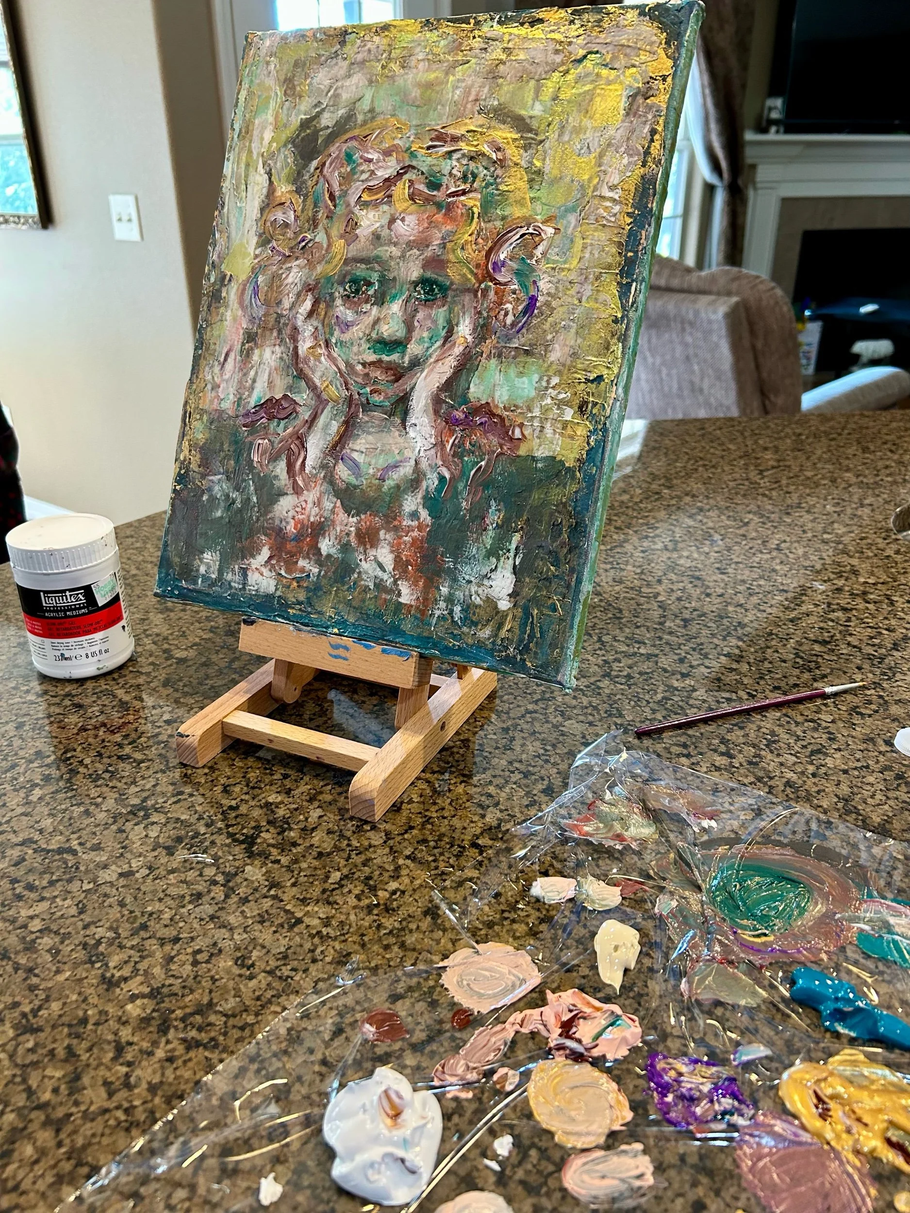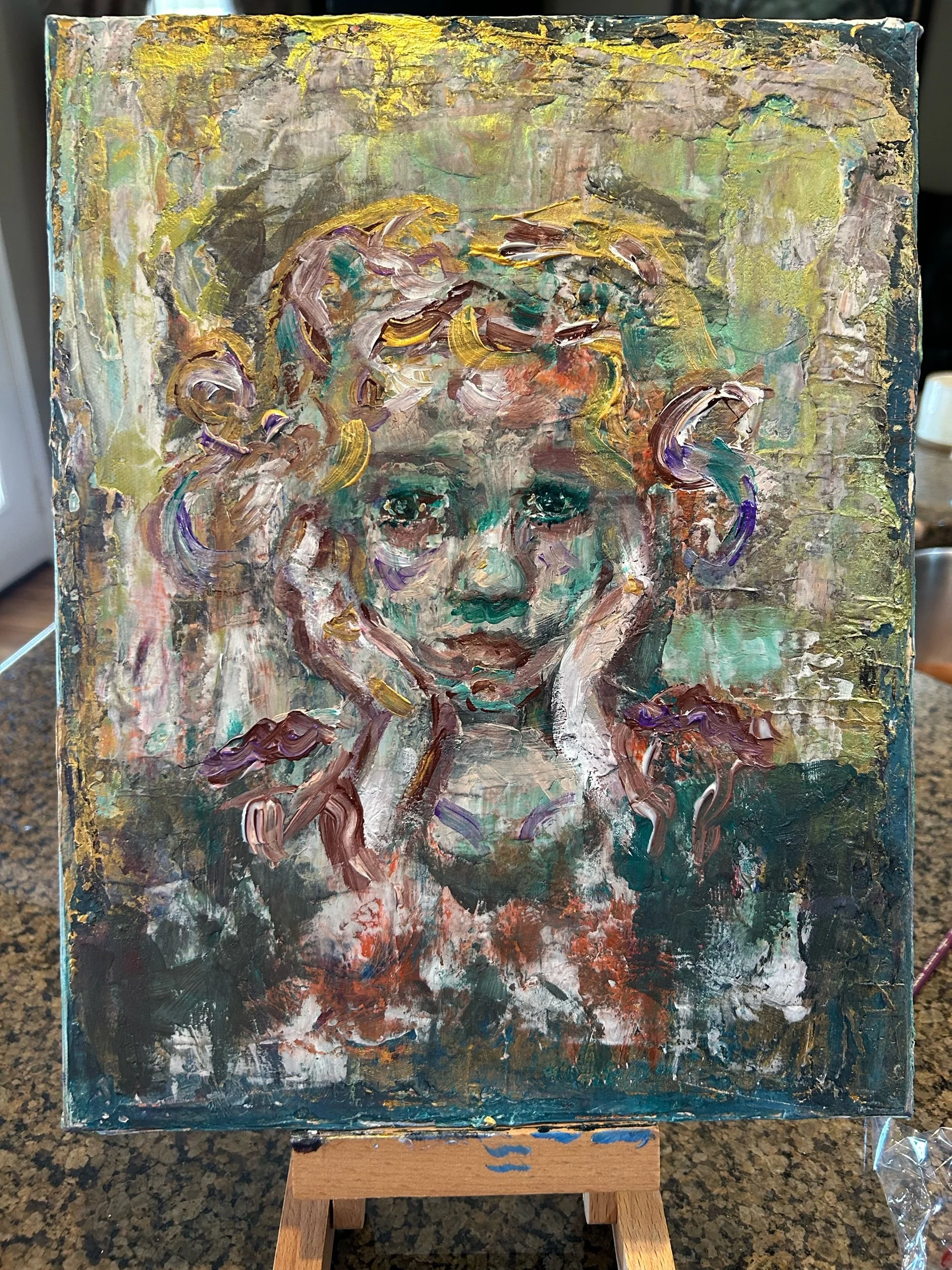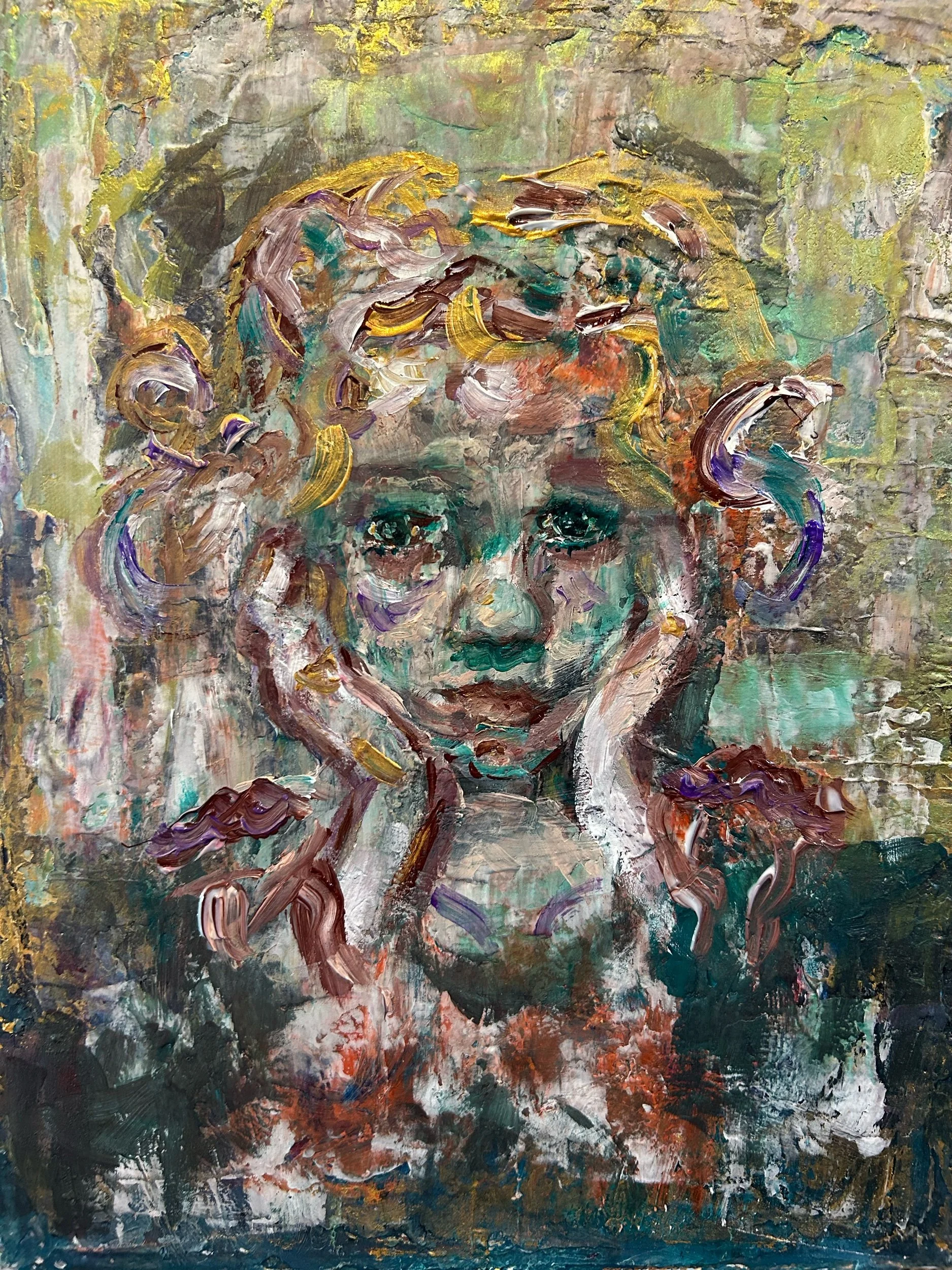 A tender and expressive portrayal of a child-like figure emerges from a dense and highly textured surface, layered with energetic brushwork and sculptural strokes. The subject’s wide, knowing eyes—rendered in deep emeralds and teals—hold the gaze in a moment of introspection or wonder, while her hands frame the face in a gesture both protective and contemplative.