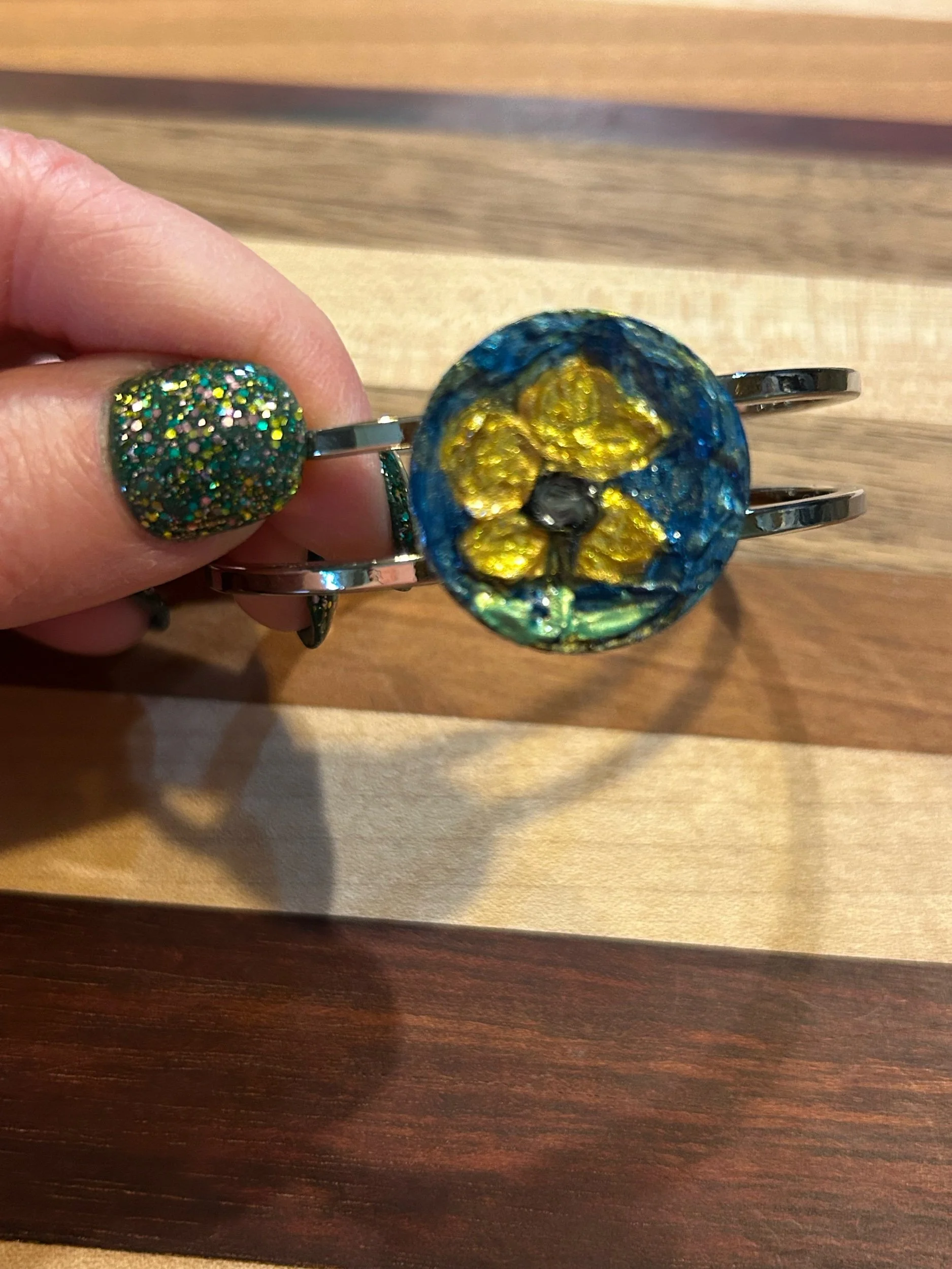 This hand painted bracelet features a yellow daisy, created with modeling clay, painted in acrylic paint and sealed in high gloss medium. Comes with a complimentary hand painted water color card.