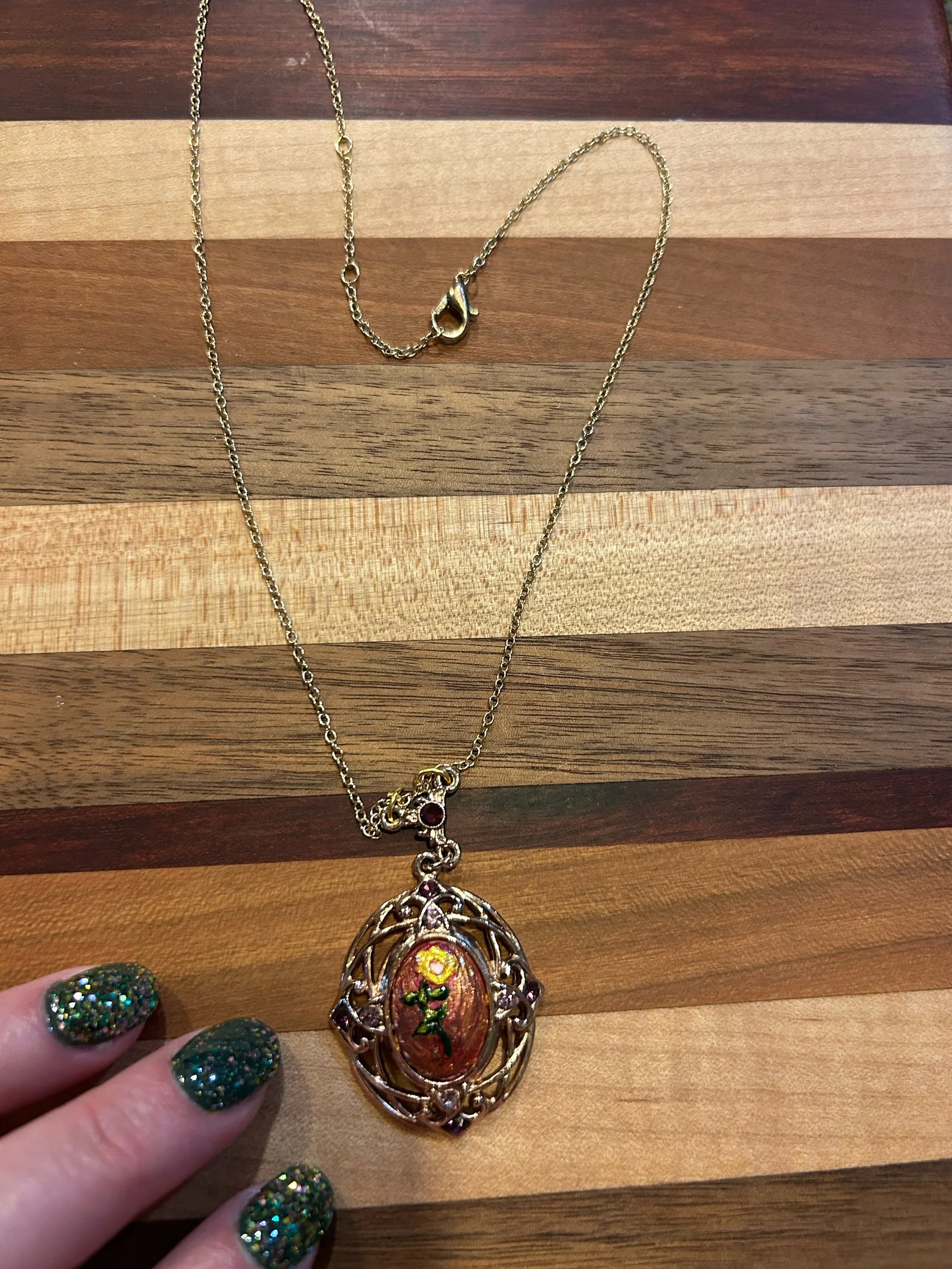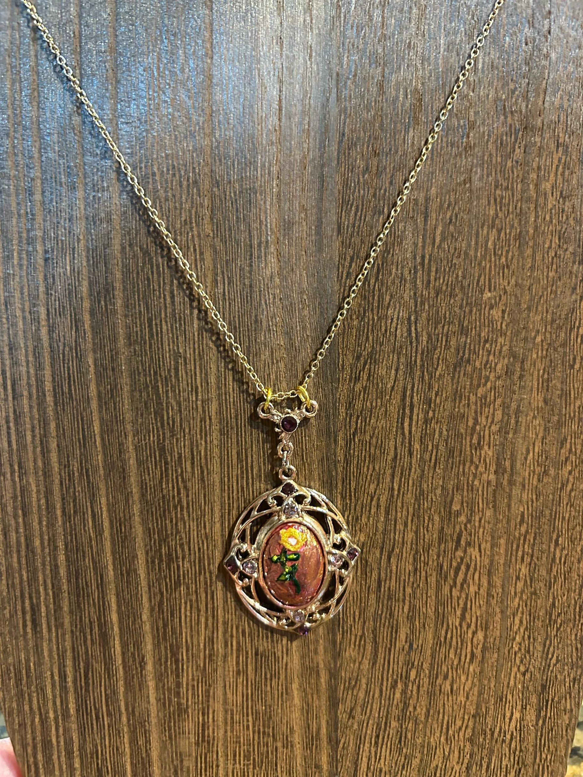 This 18” gold plated nickel free necklace has a hand painted purple and gold pendant that has the perfect amount of romance and mystery. Painted in acrylic and sealed in high gloss medium. Comes with a complimentary hand painted water color card!