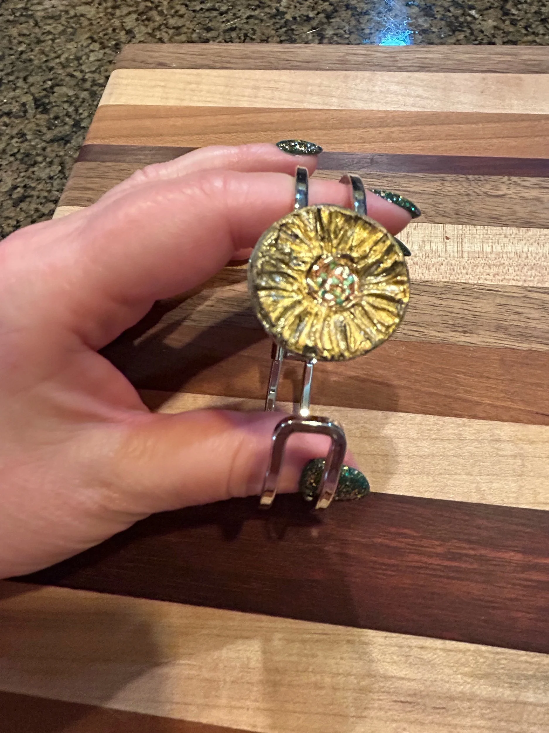 This silver plated hand painted sunflower bracelet was created with modeling clay and painted with acrylic paint, sealed with a high gloss medium. Comes with a complimentary hand painted water color card.
